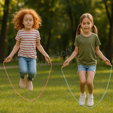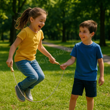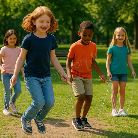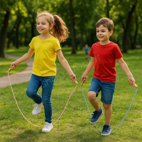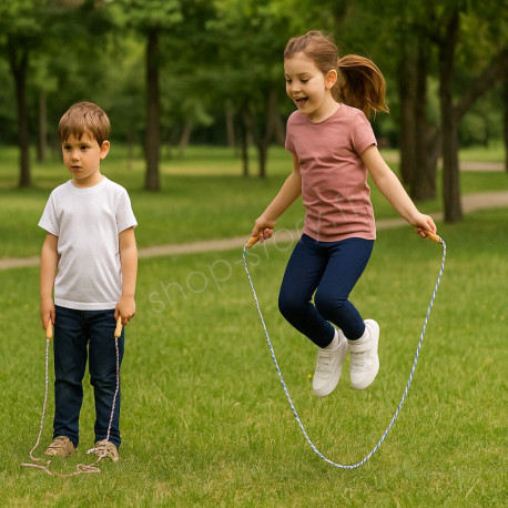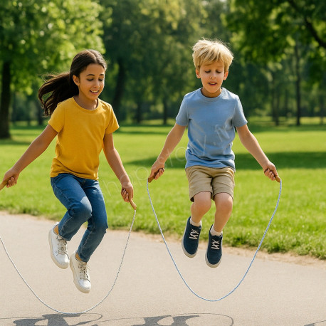 Longueur de la corde : 2,10 m — Adaptée aux enfants dès 5 ans et aux adultes jusqu'à 1m70.