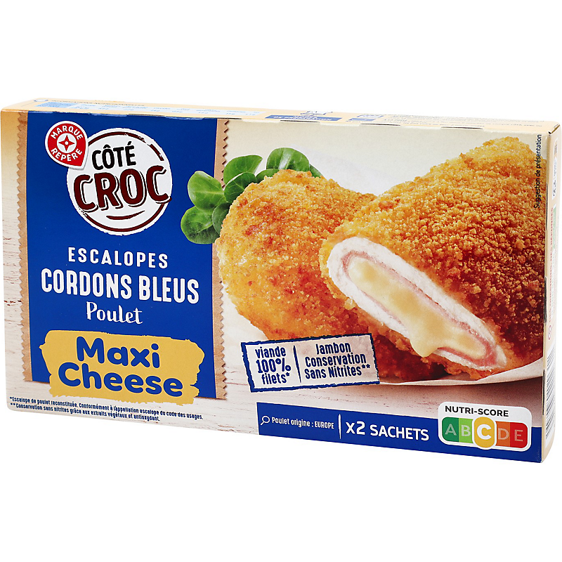 Escalope cordon bleu à base de viande de filets de poulet traitée en salaison, aromatisée et reconstituée, garnie de fromage fondu et de jambon de dinde cuit standard aromatisé, enrobée d'une panure 23 %, frite et cuite COTE CROC