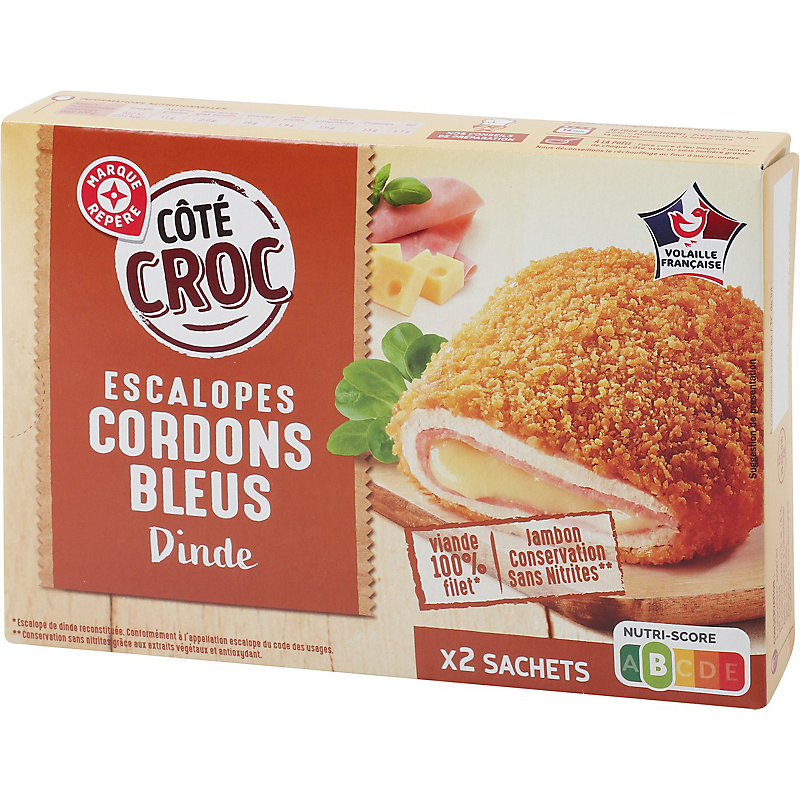 Escalope cordon bleu de dinde reconstituée traitée en salaison, aromatisée, frite et cuite COTE CROC