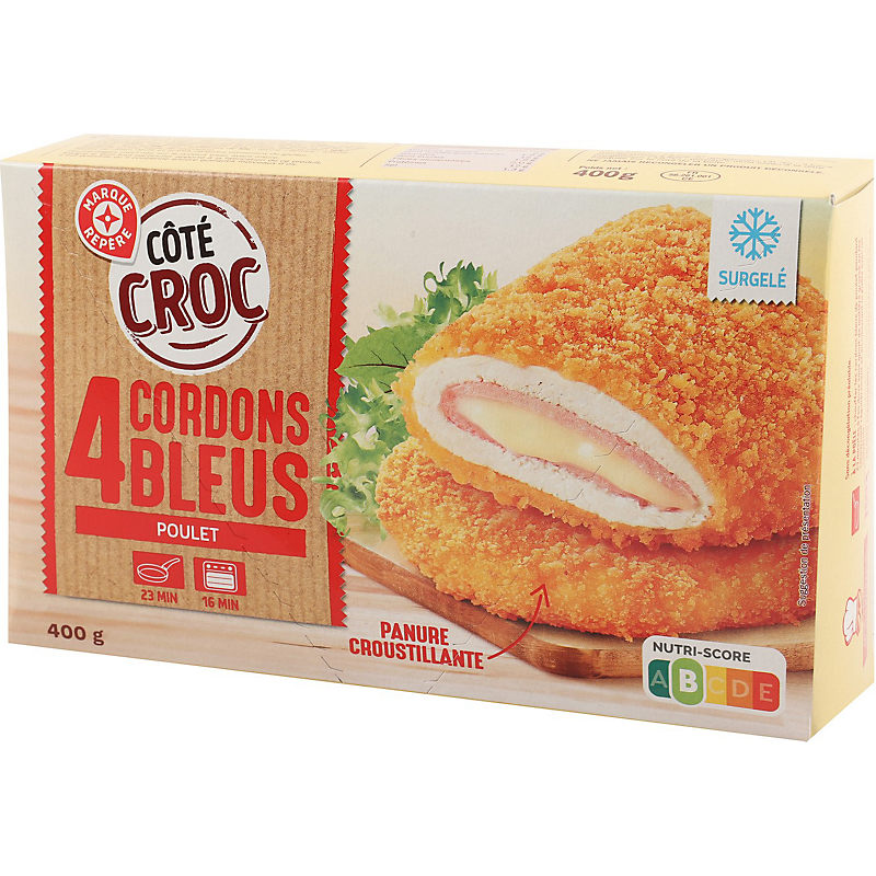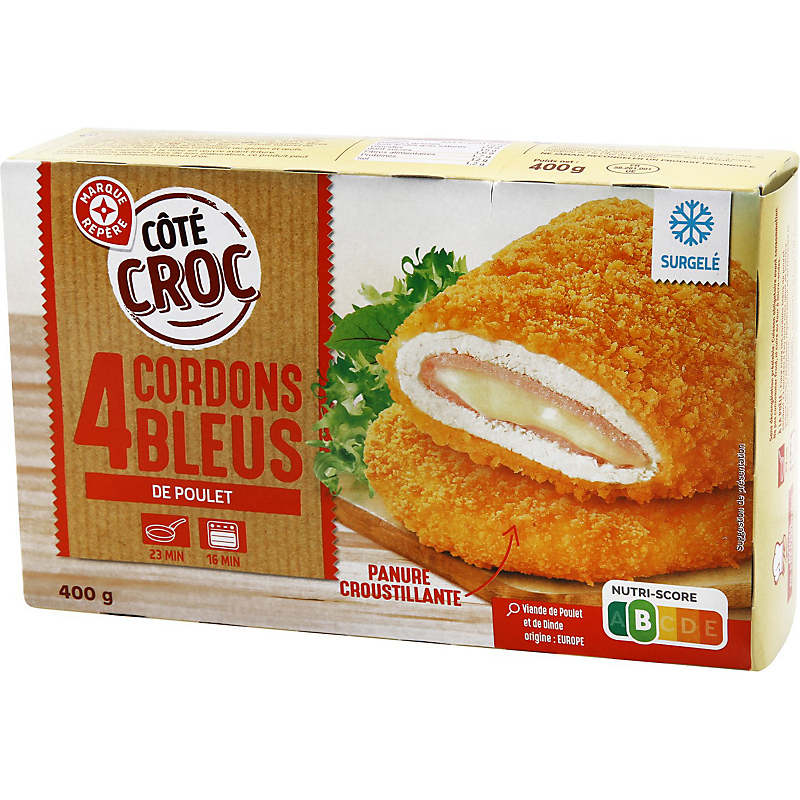 Viande de filets de poulet traitée en salaison reconstituée 50 %, garnie de jambon de dinde cuit standard aromatisé 15 % et de fromage fondu 10 %, enrobée de panure 25 %, frite, cuite et surgelée COTE CROC