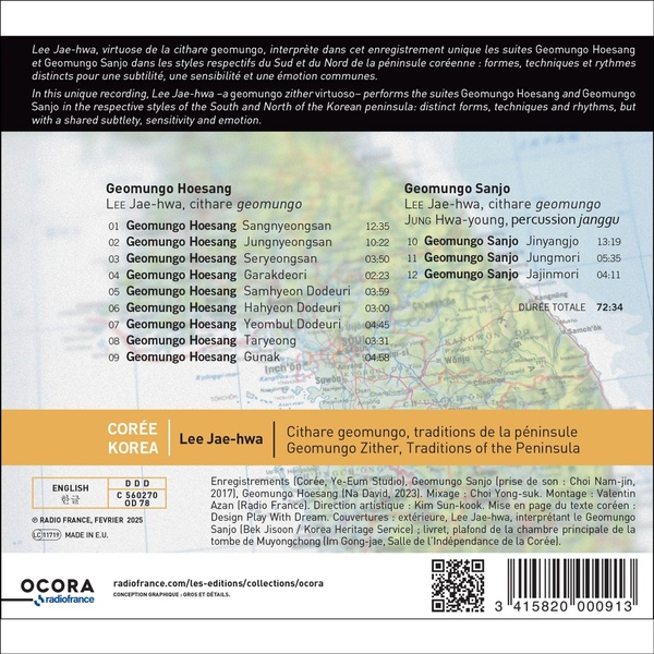 Lee Jae-hwa, virtuose de la cithare geomungo, interprète dans cet enregistrement unique les suites Geomungo Hoesang et Geomungo Sanjo dans les styles respectifs du Sud et du Nord de la péninsule coréenne : formes, techniques et rythmes distincts pour une subtilité, une sensibilité et une émotion communes. Le geomungo, cithare à 6 cordes, est doté de 16 frettes sur une caisse de résonance en bois de paulownia. Ses origines remontent à l''ancien royaume de Goguryeo (37 av. J.-C. à 668 apr. J.-C.), dominant le territoire de l''actuelle Corée du Nord ainsi qu''une vaste partie de la Mandchourie. Sa riche histoire s''étend sur environ 1600 ans. Le geomungo produit des sons impressionnants, par le biais des frictions résultant de la frappe des cordes par le plectre ou des bruissements créés par les mouvements subtils de la main gauche sur les cordes.