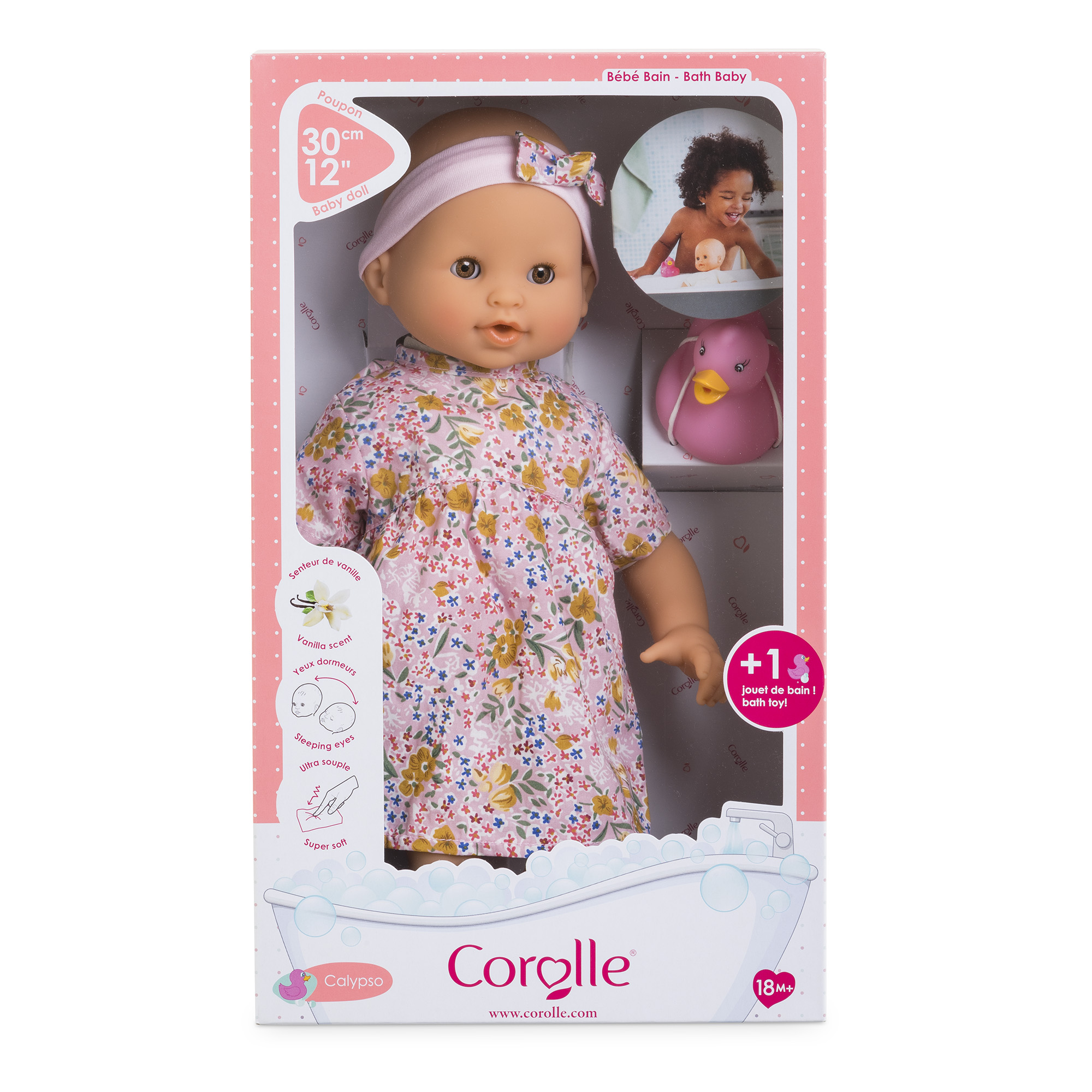 En avant moussaillons ! Bébé Bain Calypso raffole des jeux d'eau ! Ce petit poupon est le compagnon de baignade qui aide les enfants à se familiariser en douceur avec tout type de milieu aquatique : • dans le bain (eau savonneuse) • à la piscine (eau chlorée) • et à la mer (eau salée). L’attache cousue dans son dos permet de le suspendre pour le faire sécher après le bain et les jeux d’eau. Il mesure 30cm, la taille parfaitement adaptée aux petits bras et mains de l'enfant pour le manipuler. Son corps souple lui permet de prendre les mêmes positions qu'un vrai bébé. Son visage, ses bras et ses jambes, à la délicate senteur de vanille, sont en vinyle doux au toucher. Son pouce peut se maintenir dans sa bouche. Avec ses yeux noisette dormeurs, il fait dodo quand on le couche sur le dos. Il est habillé d'une jolie robe et coiffé d'un bandeau assorti. Il est livré avec un canard de bain qui crache de l'eau quand on appuie dessus après l'avoir plongé immergé. Il dispose d'une collection variée de vêtements et d'accessoires dans la gamme mon premier poupon Corolle pour pouponner pour la première fois. Dès 18 mois.