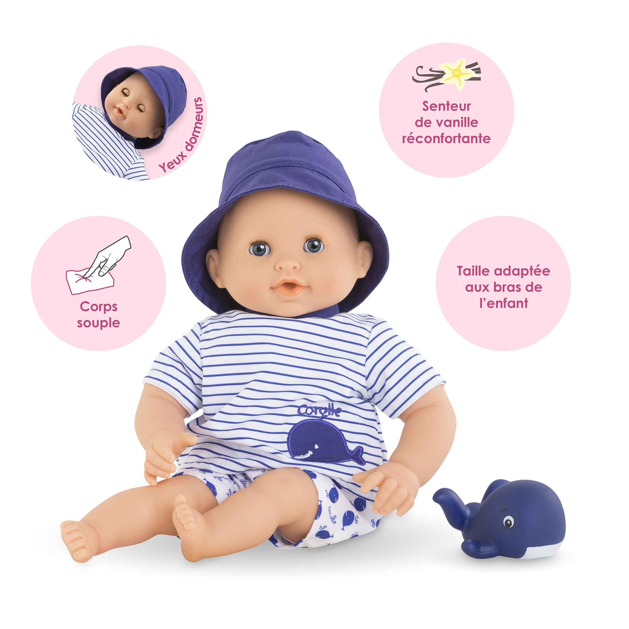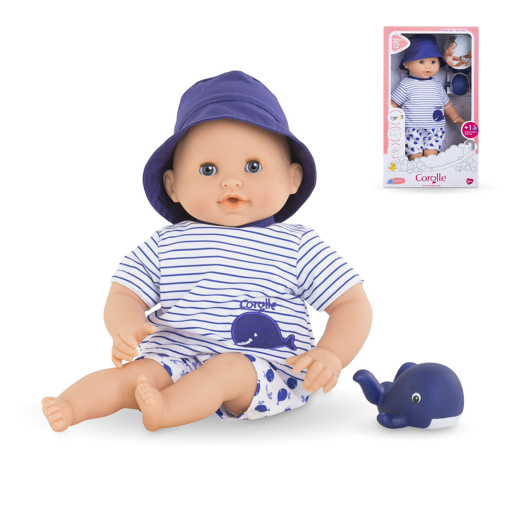 En avant moussaillons ! Bébé Bain Marin raffole des jeux d'eau ! Ce petit poupon est le compagnon de baignade qui aide les enfants à se familiariser en douceur avec tout type de milieu aquatique : • dans le bain (eau savonneuse) • à la piscine (eau chlorée) • et à la mer (eau salée). L’attache cousue dans son dos permet de le suspendre pour le faire sécher après le bain et les jeux d’eau. Il mesure 30cm, la taille parfaitement adaptée aux petits bras et mains de l'enfant pour le manipuler. Son corps souple lui permet de prendre les mêmes positions qu'un vrai bébé. Son visage, ses bras et ses jambes, à la délicate senteur de vanille, sont en vinyle doux au toucher. Son pouce peut se maintenir dans sa bouche. Avec ses yeux dormeurs, il fait dodo quand on le couche sur le dos. Il est habillé d'une blouse & d'un short et coiffé d'un bob. Il est livré avec une baleine de bain qui crache de l'eau quand on appuie dessus après l'avoir plongé immergée. Bébé Bain Marin dispose d'une collection variée de vêtements et d'accessoires dans la gamme mon premier poupon Corolle pour pouponner pour la première fois. Dès 18 mois.