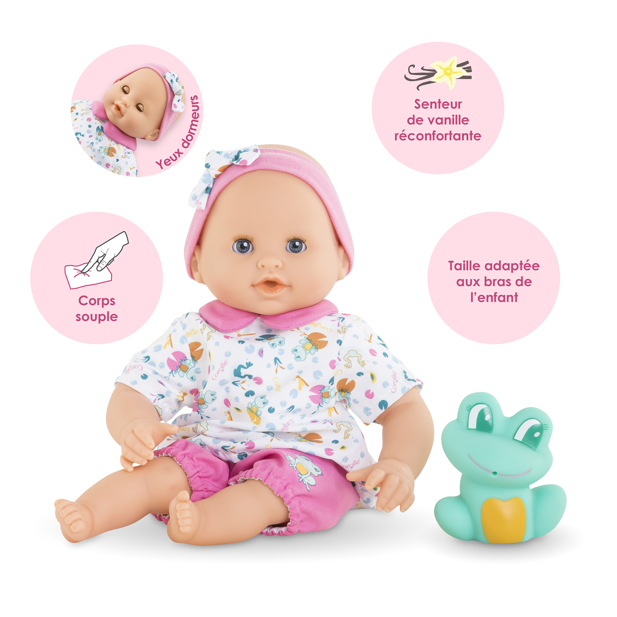 En avant moussaillons ! Bébé Bain Océane raffole des jeux d'eau ! Ce petit poupon est le compagnon de baignade qui aide les enfants à se familiariser en douceur avec tout type de milieu aquatique : • dans le bain (eau savonneuse) • à la piscine (eau chlorée) • et à la mer (eau salée). L’attache cousue dans son dos permet de le suspendre pour le faire sécher après le bain et les jeux d’eau. Il mesure 30cm, la taille parfaitement adaptée aux petits bras et mains de l'enfant pour le manipuler. Son corps souple lui permet de prendre les mêmes positions qu'un vrai bébé. Son visage, ses bras et ses jambes, à la délicate senteur de vanille, sont en vinyle doux au toucher. Son pouce peut se maintenir dans sa bouche. Avec ses yeux dormeurs, il fait dodo quand on le couche sur le dos. Il est habillé d'une blouse & d'un short et coiffé d'un bandeau assorti. Il est livré avec une grenouille de bain qui crache de l'eau quand on appuie dessus après l'avoir immergée. Bébé Bain Océane dispose d'une collection variée de vêtements et d'accessoires dans la gamme mon premier poupon Corolle pour pouponner pour la première fois. Dès 18 mois.