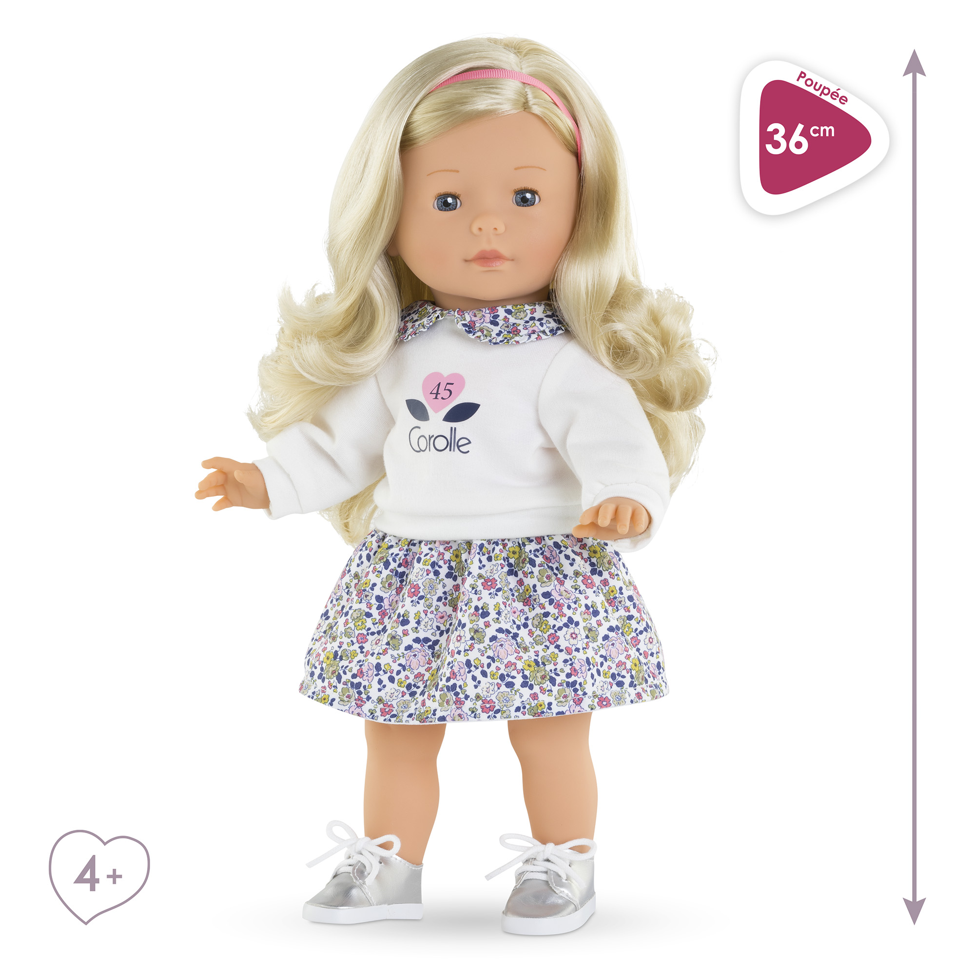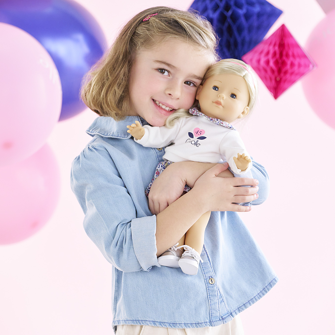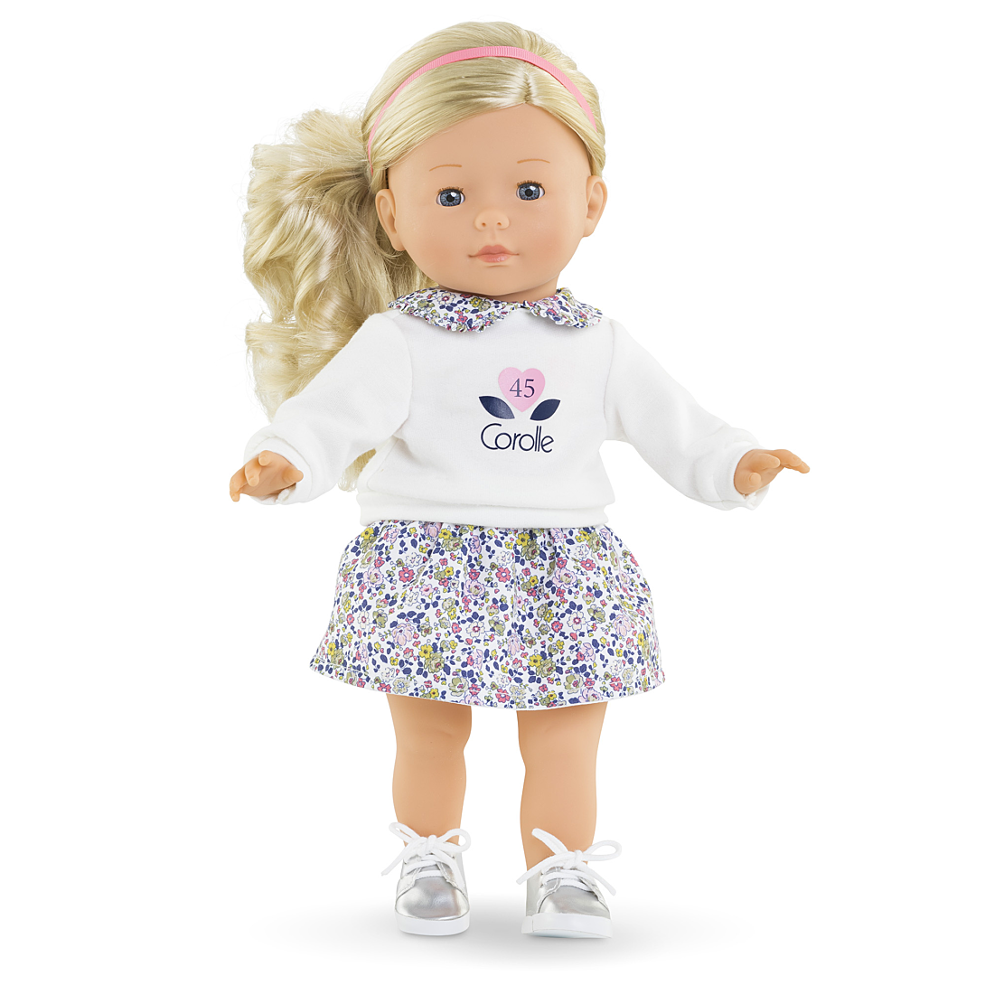 Clémence Édition Anniversaire est une poupée "collector". Clémence Edition Anniversaire, poupée de 36 cm, a un corps souple « effet » sous-vêtements et de longs cheveux blonds et ondulés, faciles à coiffer. Poupée à la peau claire : son visage, ses bras et ses jambes, à la délicate senteur de vanille, sont en vinyle doux au toucher. Elle ferme ses yeux bleus quand on la couche sur le dos. À l'occasion de ses 45 ans, Corolle a voulu proposer une grande poupée habillée d'une tenue intemporelle composée d'une jolie jupe fleurie et d'un sweat avec un col caludine fleuri assorti. Pour parfaire sa tenue, elle porte une paire de chaussures argentées et un fin bandeau rose dans les cheveux. Clémence Edition Anniversaire dispose de plus de 100 références de vêtements et accessoires pour personnaliser son look à l’envi et imaginer de très nombreuses histoires inspirées du quotidien. ma Corolle : Ma poupée, Mes histoires ! Dès 4 ans.
