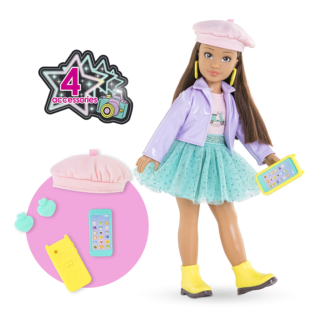 Le coffret Luna Fashion Week Milan est composé de Luna, une poupée mannequin de 28 cm, et de 4 accessoires : 1 paire de boucles d'oreilles amovibles, 1 téléphone mobile, 1 coque pour téléphone portable et 1 béret. Luna a un joli visage naturel aux traits fins qui sent bon la vanille. Ses yeux sont peints et elle possède de longs cheveux bruns. Elle porte 1 jupe turquoise en tulle, 1 T-Shirt rose, 1 veste lilas, 1 paire de bottines jaunes amovibles et 1 paire de boucles d'oreille amovibles. Luna a un corps réaliste de jeune adolescente. Elle tient assise et debout toute seule. Les Corolle Girls sont déclinées en plusieurs modèles et disposent de coffrets dressing pour encore plus de jeux ! Dès 4 ans. Corolle Girls, mes meilleures amies.