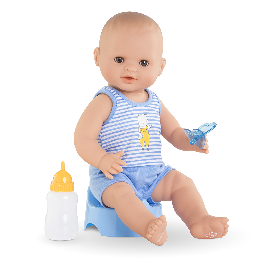 Paul Fait Pipi est un grand poupon Corolle pour jouer et faire comme les grands. Avec son pot, son biberon à remplir et sa tétine, c’est l'allié pour l’apprentissage de la propreté ! Ce grand poupon Corolle sexué garçon : - boit son biberon qui peut être rempli d’eau , - fait pipi « pour de vrai » sur son pot lorsqu’on lui appuie sur le ventre (plus d’eau partout dans la maison !) , - et prend son bain. Grâce à son corps, à la délicate senteur de vanille, totalement en vinyle doux au toucher, il peut aller dans l’eau tout en tenant assis. Il mesure 36cm, une taille parfaitement adaptée aux petits bras de l'enfant pour le câliner, le materner et reproduire les gestes qui font devenir grand. Avec ses yeux dormeurs, il fait dodo quand on le couche sur le dos. Il est habillé d’un bloomer et d’un débardeur rayé. Son pouce peut se maintenir dans sa bouche. Paul Fait Pipi dispose d'une collection complète de vêtements et d’accessoires mon grand poupon Corolle pour imiter les gestes du quotidien et s’inventer des scénarios de jeu multiples et variés. Il ne peut pas porter de bottes. Dès 2 ans.