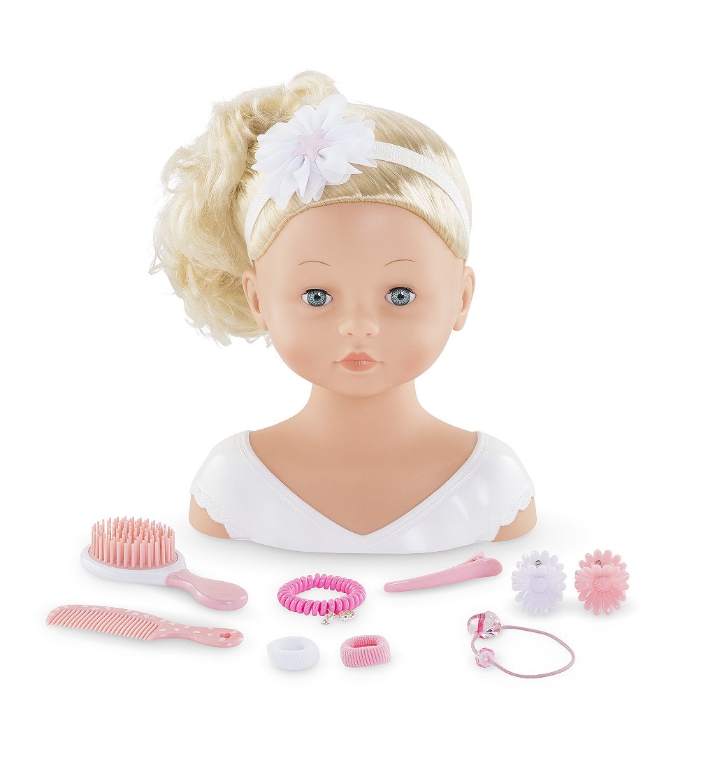 La Tête à Coiffer possède 10 accessoires réalistes (1 bandeau élastique blanc avec 1 fleur, 1 brosse à cheveux, 1 peigne, 2 pinces à griffes, 1 pince à cheveux plate, 1 élastique avec un cœur, 1 élastique à spirale et 2 chouchous) pour créer de nombreuses coiffures ! Les cheveux de la tête à coiffer sont implantés de manière régulière pour permettre un rendu le plus naturel possible. La Tête à Coiffer est en vinyle doux au toucher à la délicate senteur de vanille. Les yeux sont fixes avec des cils. Le Coffret Coiffure Corolle complète parfaitement la Tête à Coiffer pour passer des heures à imaginer toujours plus de nouvelles coiffures ! Coiffer, c’est jouer. Dès 3 ans.