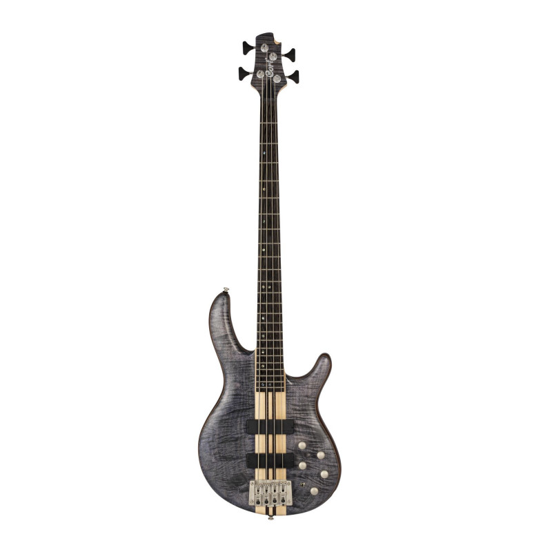 Cort A4 Plus FMMH - Basse électrique série Artisan A - Bleu Noir pores ouverts Conçues pour les bassistes qui exigent un look, un son, une jouabilité et des caractéristiques haut de gamme, les basses série Artisan proposent des bois, une qualité de fabrication et des composants de premier ordre, à l'image des micros Bartolini et de l'accastillage Hipshot. A4 Plus FMMH, 4 cordes, table érable flammé, corps acajou, manche traversant 5 pièces érable/panga panga, touche panga panga, 2 micros doubles MK-1 et EQ active Bartolini MK-1, switch EQ on/off, chevalet Hipshot Transtone avec cordes traversantes, mécaniques Hipshot, accastillage platine.