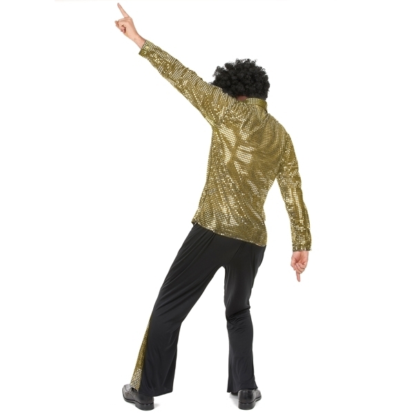 Messieurs, revenez plusieurs années auparavant en vous déguisant en un homme vivant à l'époque du disco. Pour ce faire, portez ce costume comprenant une chemise dorée à paillettes et un pantalon noir décoré avec les mêmes pièces brillante* Couleur : noir et doré pailleté * Matière : 100% Polyester * Lavage à la main Fonctions : déguisement Contenu : 1 chemise à paillettes, 1 pantalon noir et paillettes