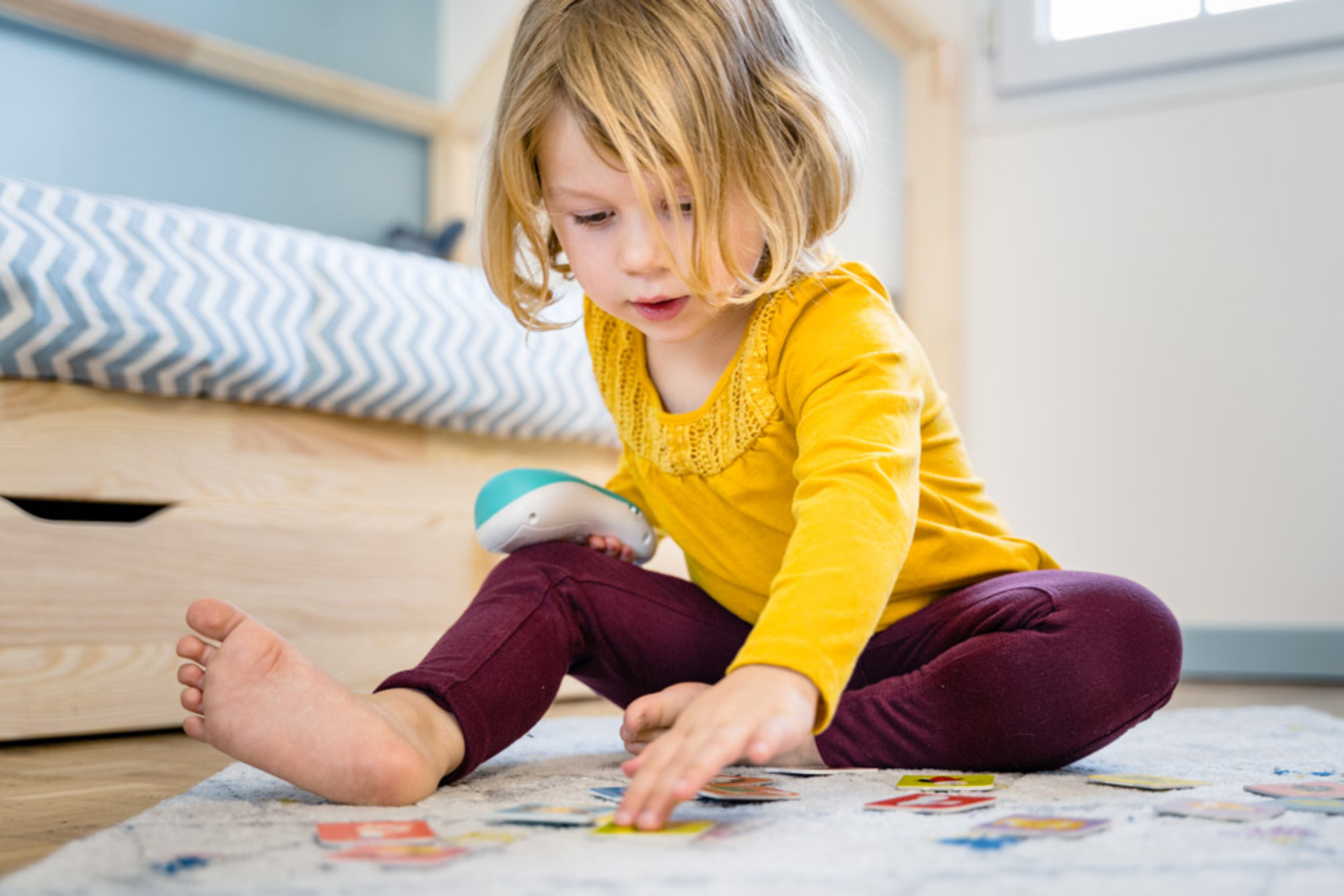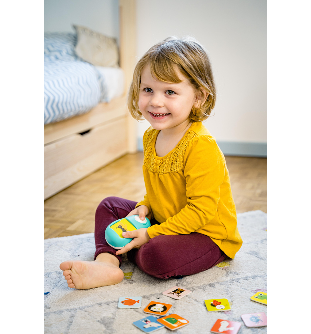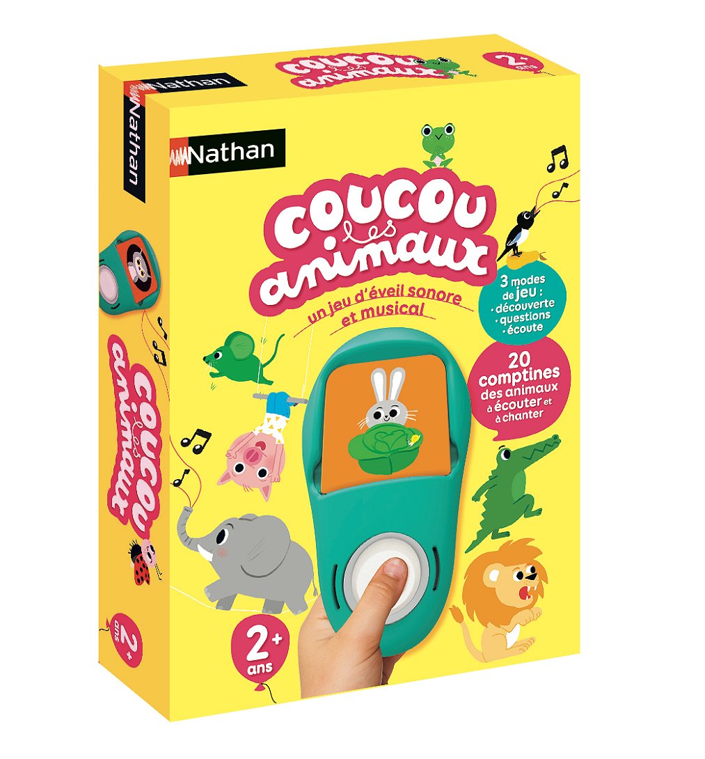 De la petite fourmi au gros éléphant, 20 comptines à écouter et à chanter encore et encore! En mode découverte, l'enfant appuie sur le bouton et écoute la comptine : "Petit escargot porte sur son dos sa maisonnette…" En mode questions, le jeu demande : "Je suis verte et je cours dans l'herbe, trouve-moi!" L'enfant cherche la carte : "Une souris verte..." Un jeu d'éveil musical adapté aux petites mains. Avec 3 modes de jeu.