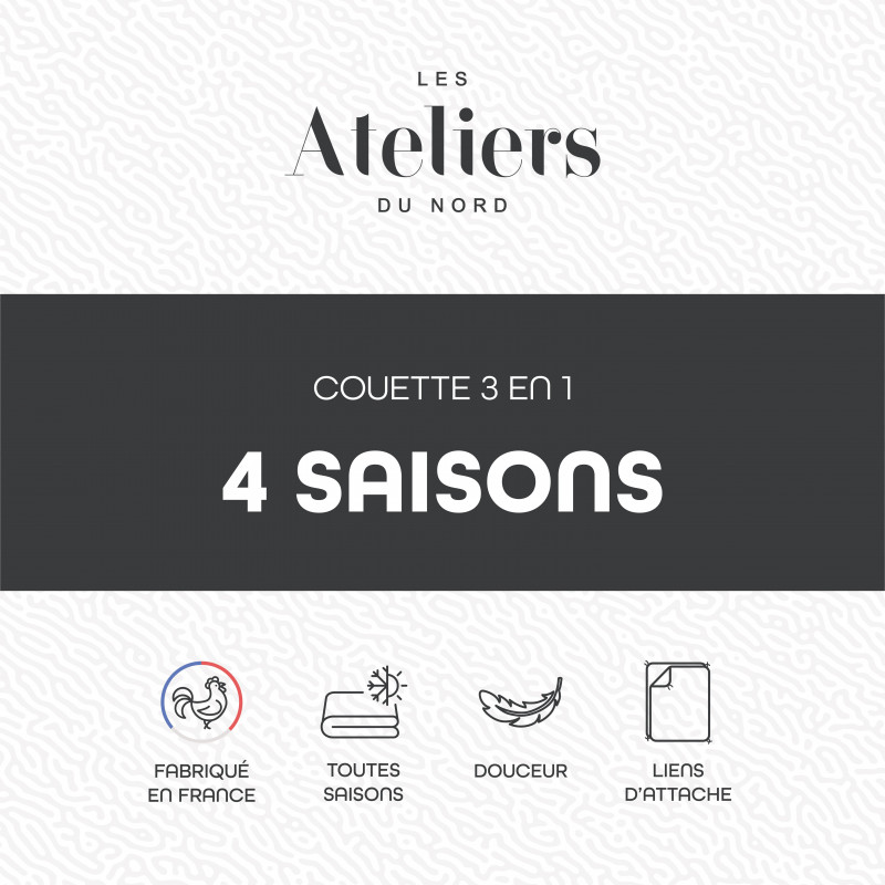La Couette 3 en 1 - 4 saisons Les Ateliers du Nord se compose de deux couettes : une couette légère (garnissage 200g/m²) idéale pour l'été, et une couette tempérée (garnissage 300g/m²) pour la demi-saison. Grâce à un système d'attaches très simple, ces deux couettes se combinent en hiver pour former une couette très chaude (500g/m²). Pratique et économique, cette couette vous accompagne ainsi tout au long de l'année.