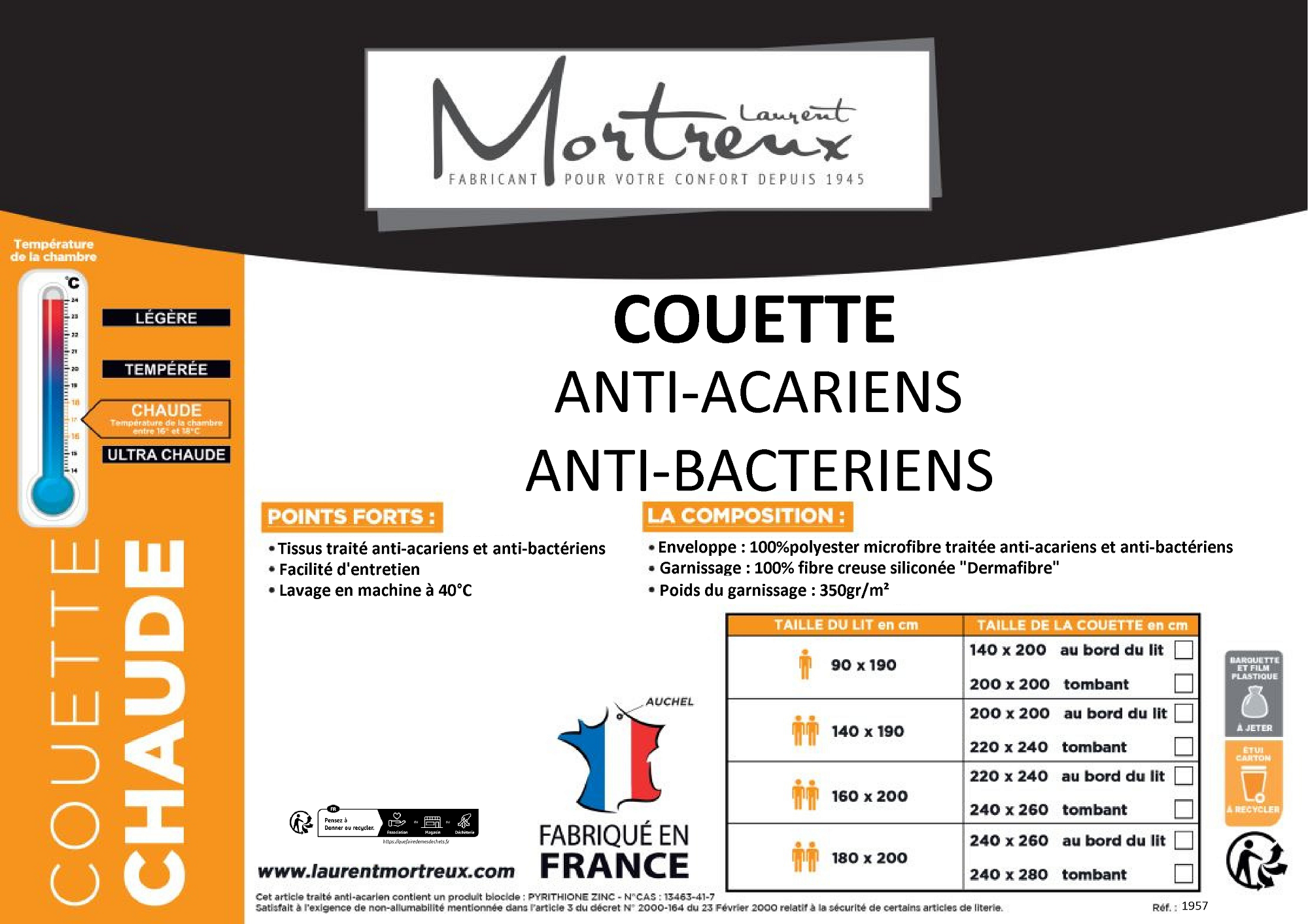 Couette 220 x 240 Tissu Microfibre 80g traité anti acariens et anti bactériens Garnissage 350g/m² de fibre Polyester Coins ronds - Double piquage de renfort - Biais polycoton couleur Couette chaude qui assurent des nuits saines Vendue dans sa valisette de rangement Fabrication Française par MORTREUX SAS