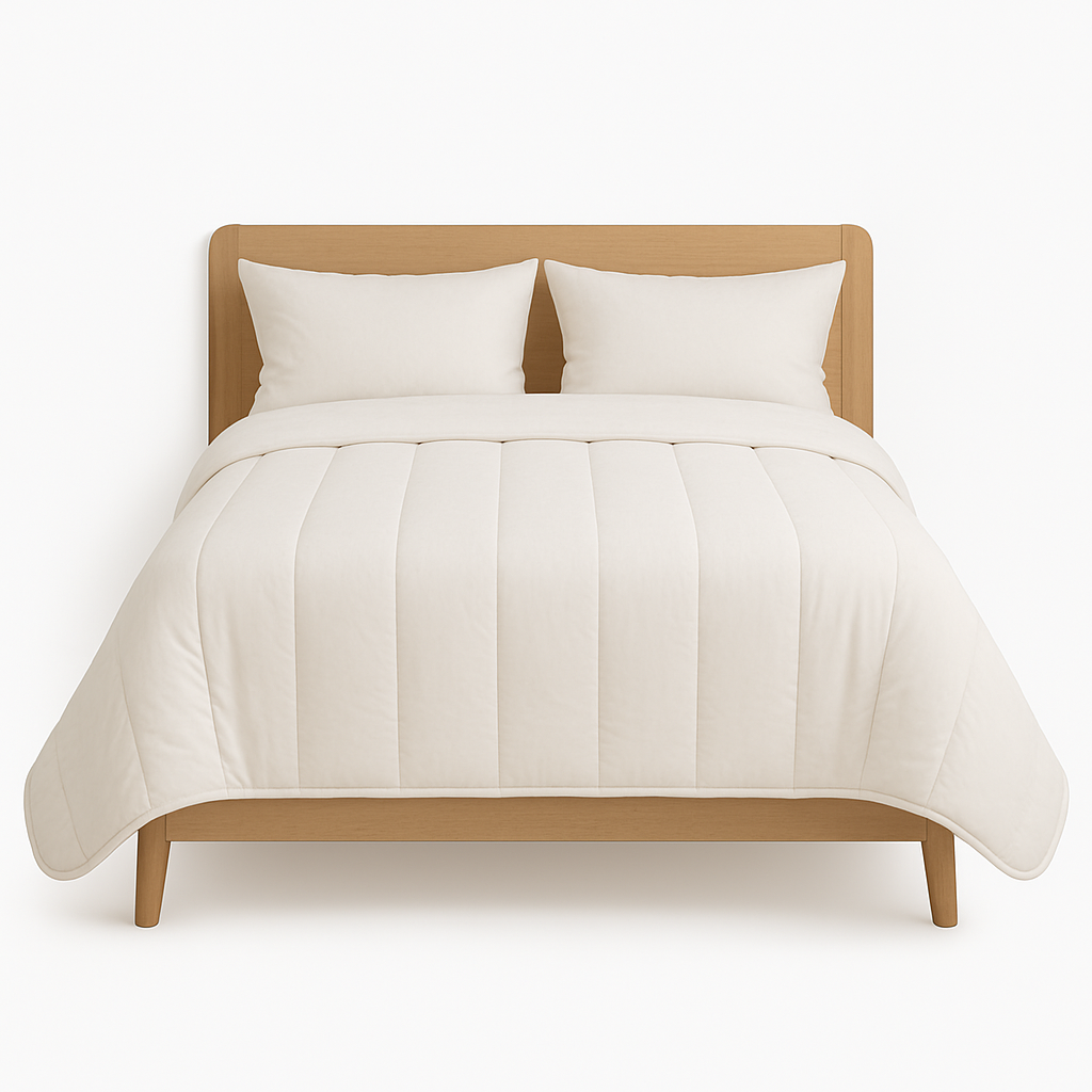 Couette 200x200 Tissu Coton 57fils blanc Garnissage 350g/m² de fibre creuse siliconée Coins ronds-Double piquage-Biais polycoton couleur Vendue dans sa housse de rangement Fabrication Française par MORTREUX SAS