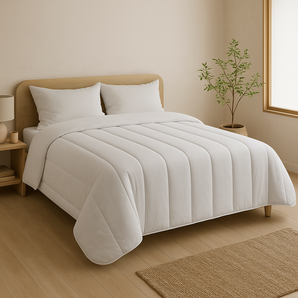 Couette 200x200 Tissu 23%coton+77%microfibre Garnissage 350g/m² de fibre creuse siliconée Coins ronds-Double piquage-Biais polycoton couleur Vendue dans sa valisette Fabrication Française par MORTREUX SAS