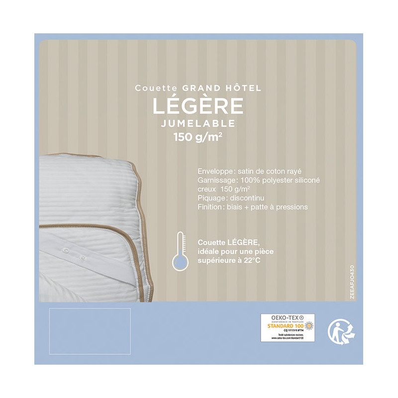 | Libellé | Couette "Fjord Grand Hotel" Légère Jumelable Satin de coton rayé Lestra |