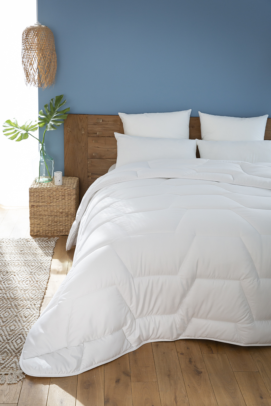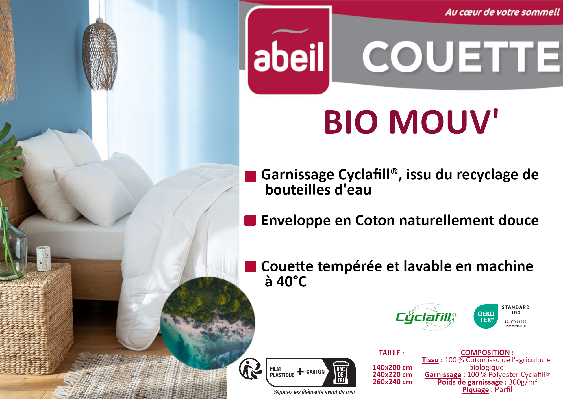 Confort et respect de l'environnement. Enveloppe en coton issu de l'agriculture biologique et garnissage Cyclafill®. Le garnissage Cyclafill®, marque déposée par Abeil, garantit l'utilisation de 50% minimum de fibres issues du recyclage de bouteilles d'eau minérale. Couette tempérée, idéale en mi-saisons ou pour les chambre dont la température se situe entre 20°C et 22°C. Grammage 300g/m². Lavable en machine à 40°C.