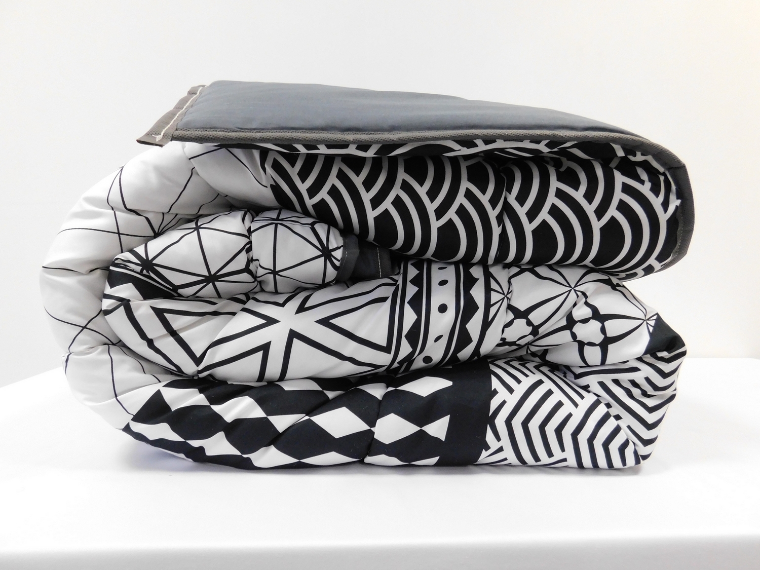 Couette double face imprimée- 1 personne (140x200) Garnissage : 250 grs par m² de fibre polyester Tissu Microfibre Coins carrés - Biais non tissé couleur aléatoire Vendue dans sa housse de rangement Lavable à 40° Pas de séchage tambour Pas de repassage Pas de nettoyage à sec Fabrication française