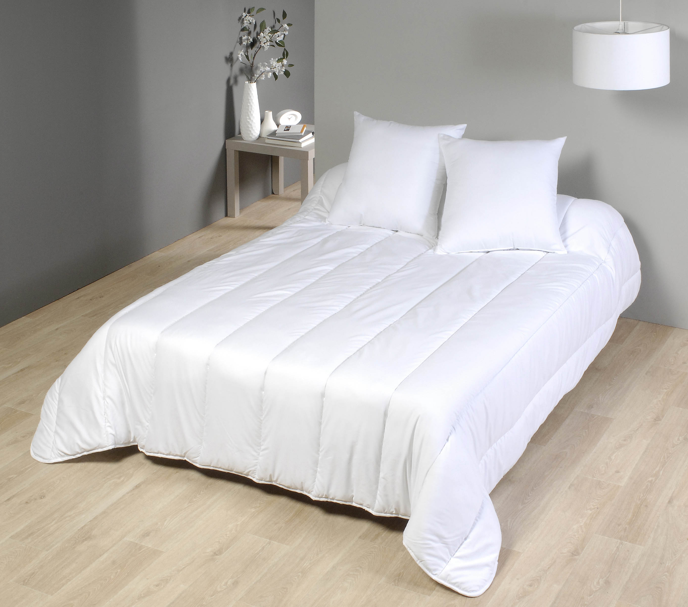 Couette 220x240 Tissu Microfibre 80g Blanc Garnissage 240grs/m² de fibre Polyester Coins ronds-Double piquage-Biais Polycoton couleur Vendue dans sa valisette de rangement Fabrication Française par MORTREUX SAS