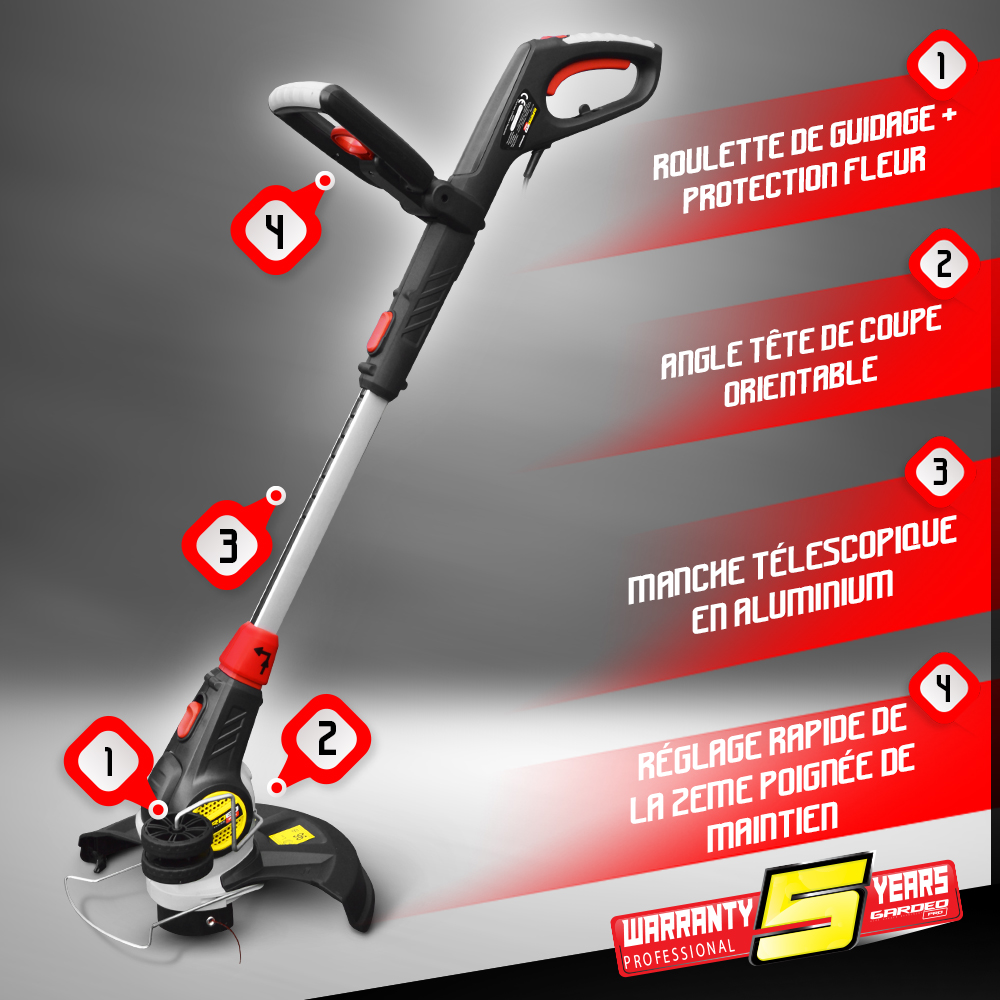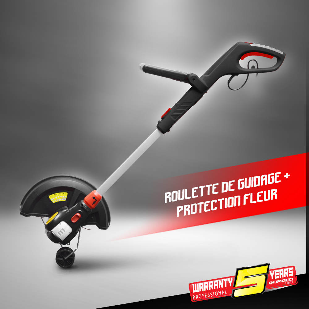 Ce coupe-bordure de la marque Gardeo Pro est équipé d'un moteur performant d'une puissance de 600 W. Il dispose d'une largeur de coupe de 300 mm et bénéficie d'un système d'avance du fil par << Tap & Go >>. Ce coupe-bordure offre un confort de travail et une qualité de finition impeccable. Il est équipé d'un manche téléscopique en aluminium, d'une poignée softgrip inclinable, d'une roulette de guidage, d'une protection pour préserver les fleurs, sa tête de coupe est inclinable et tournante pour passer en fonction dresse bordures......difficile de faire plus complet.