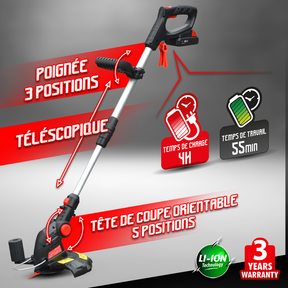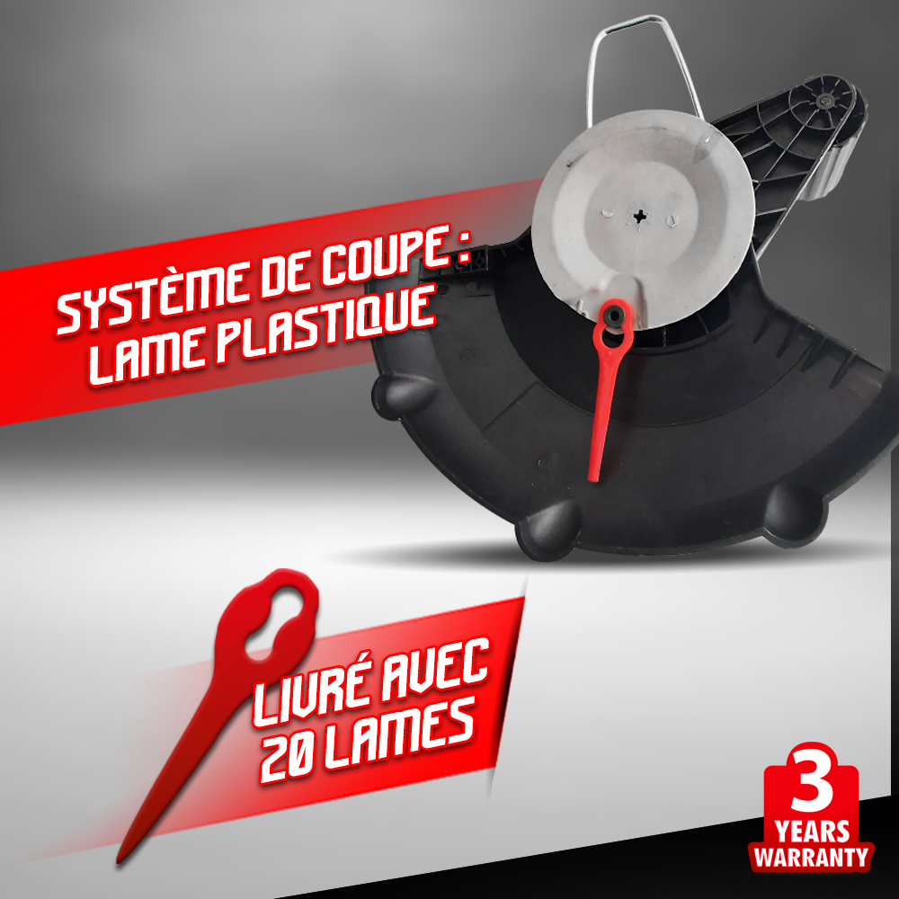 Coupe bordures rechargeable 20V avec un diamètre de coupe de 25cm Il est équipé d'un manche téléscopique en aluminium et d'une tête orientable 5 positions. Il est livré avec 20 lames en plastique