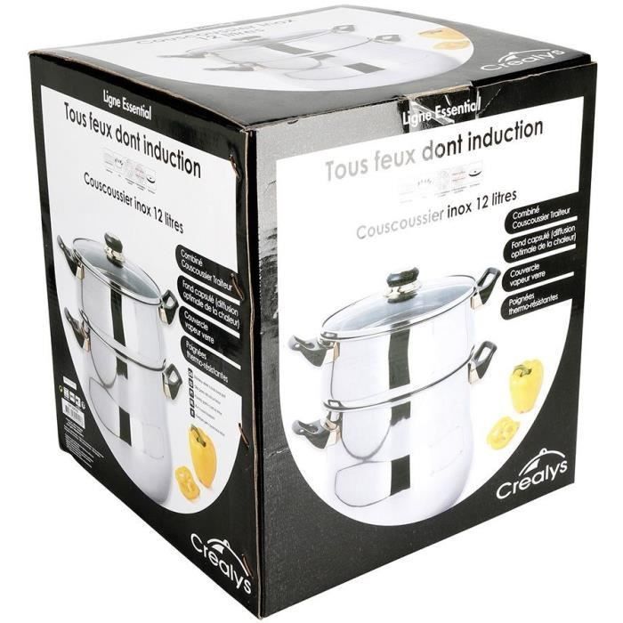 Couscoussier 12 L Inox Gamme ESSENTIAL Ø 24 cm H 21 cm Avec poignée thermorésistante noire 1er niveau H 21 cm 8 L, 2ème niveau H 10 cm 4 L Epaisseur corps 0.5 mm Epaisseur fond 2.5 mm Tous feux dont induction