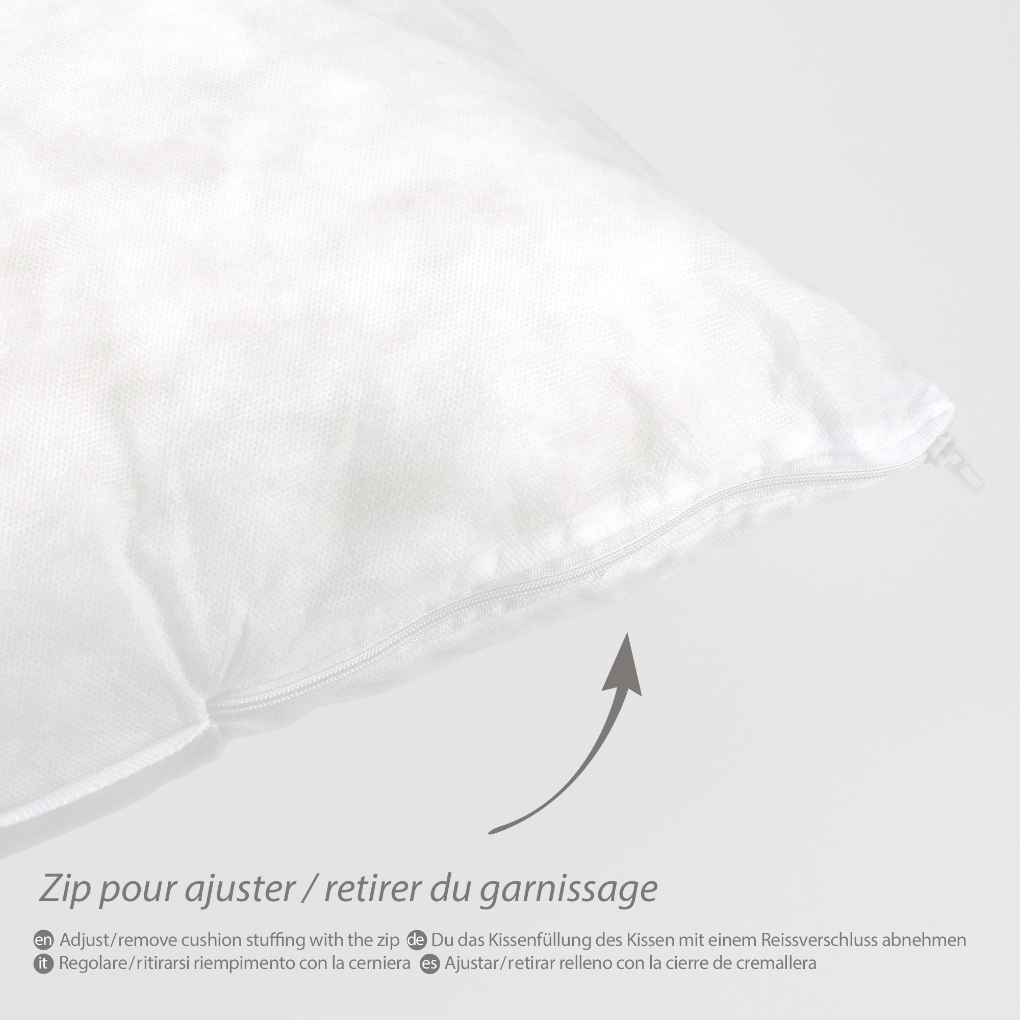 - L'enveloppe du coussin de garnissage comporte un zip plastique de ±20 cm qui vous permet d'ajouter ou de retirer du garnissage pour obtenir le confort souhaité et l'aspect de gonflant recherché pour votre housse de coussin.