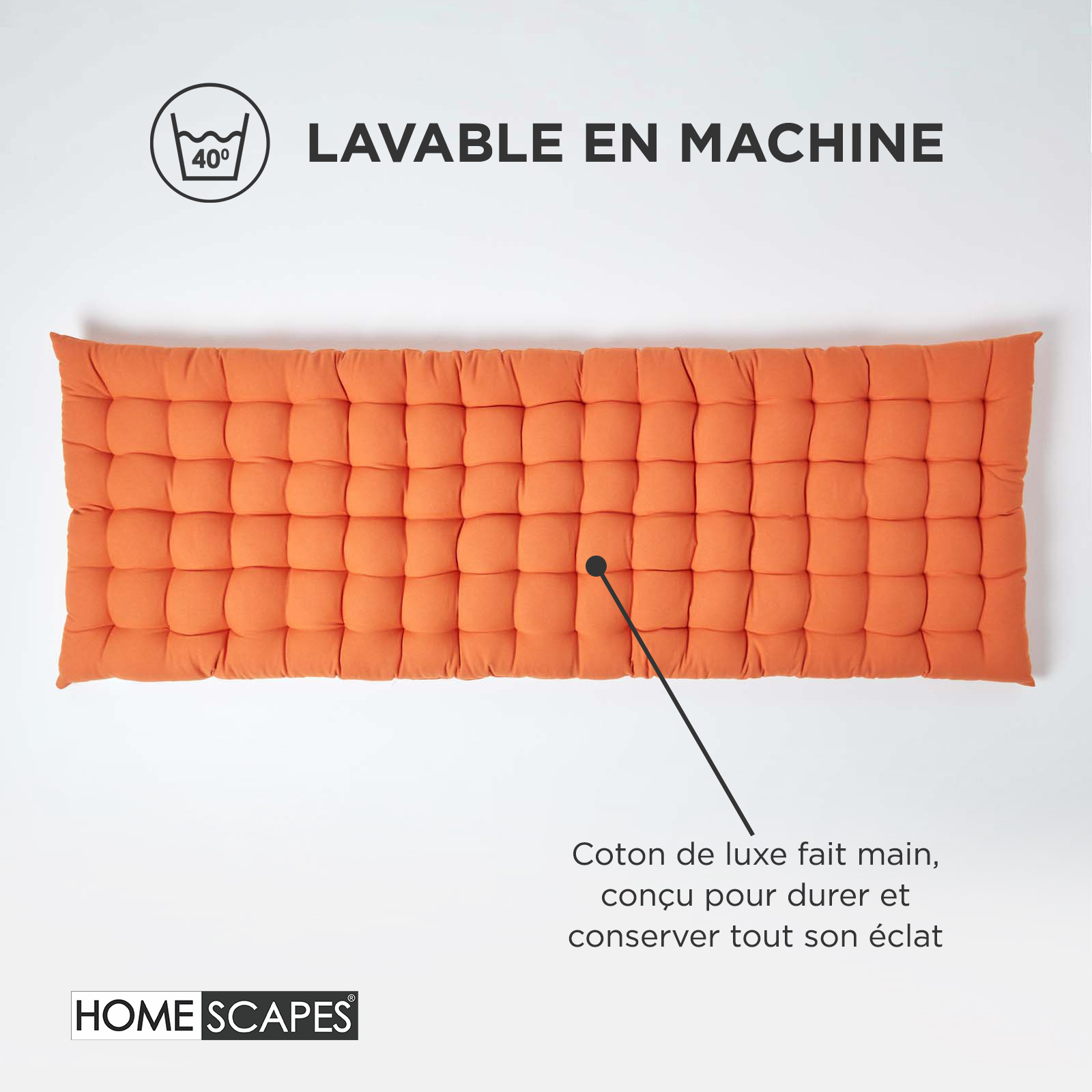 Craquez pour ce coussin pour banc de jardin capitonné qui apportera une touche de modernité été de couleur à votre jardin ou votre balcon. En 100% coton, ce coussin est à la fois doux et sain, le coton étant une matière naturelle. De plus le garnissage dense en fibres de polyester offre assise confortable et une longue durée de vie du produit. Ce coussin polyvalent peut être utilisé comme coussin d'assise pour un banc, sur une chaise longue ou comme matelas de sol. Il est également possible de combiner deux coussins pour créer une assise avec dossier. Homescapes propose une large sélection de linge de maison et les nappes, serviettes de table et galettes de chaise assorties sont disponibles sur notre boutique. Ce matelas de sol est également disponible en 9 coloris et 2 tailles (deux places 108 x 42 x 5 cm et trois places 143 x 48 x 5 cm). Ce matelas n'est pas imperméable ou déperlant, nous vous conseillons donc de le ranger à l'abri de l'humidité et si possible en intérieur après usage.