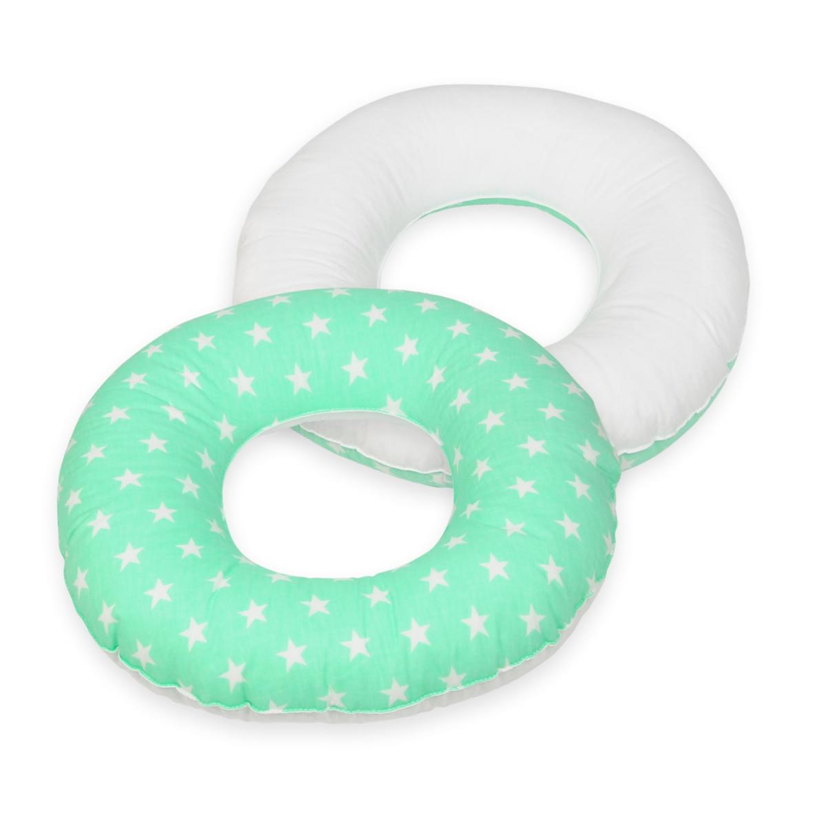 Coussin rond post natal etoiles blanches sur fond bleu menthe blanc