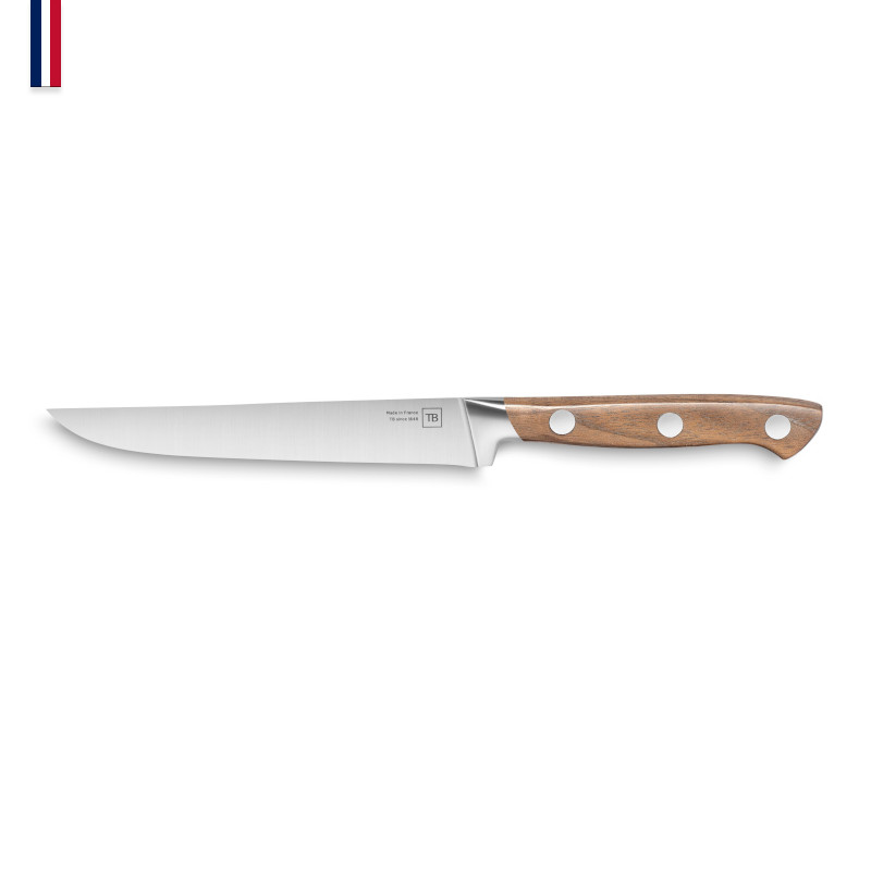 Couteau à steak forgé Made In France. Le format compact de ce couteau à steak de la collection Georges lui permet d'être extrêmement polyvalent. Couteau Made In France, sa lame de 12 cm en acier inox forgé pleine soie ainsi que son manche ergonomique en Noyer en font l'outil parfait pour les découpes de précision et pour une utilisation fréquente. La forme traditionnelle du manche de Georges permet une bonne prise en main, et la garde présente sur la mitre permet d'assurer son geste de coupe.