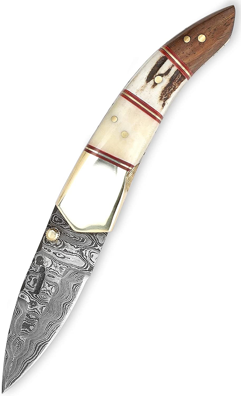 (nous vous conseillons d'affûter la lame pour avoir une utilisation optimale), Véritable acier Damas. Fichiers Travailler dans Spine,est livré avec une housse en cuir fait main,Fait à la main, Liner Lock Mécanisme,cerf, os et manche en bois,longueur de la lame: 3,0 pouces. En longueur: 6.5 pouces. Longueur fermée: 3,5 pouces