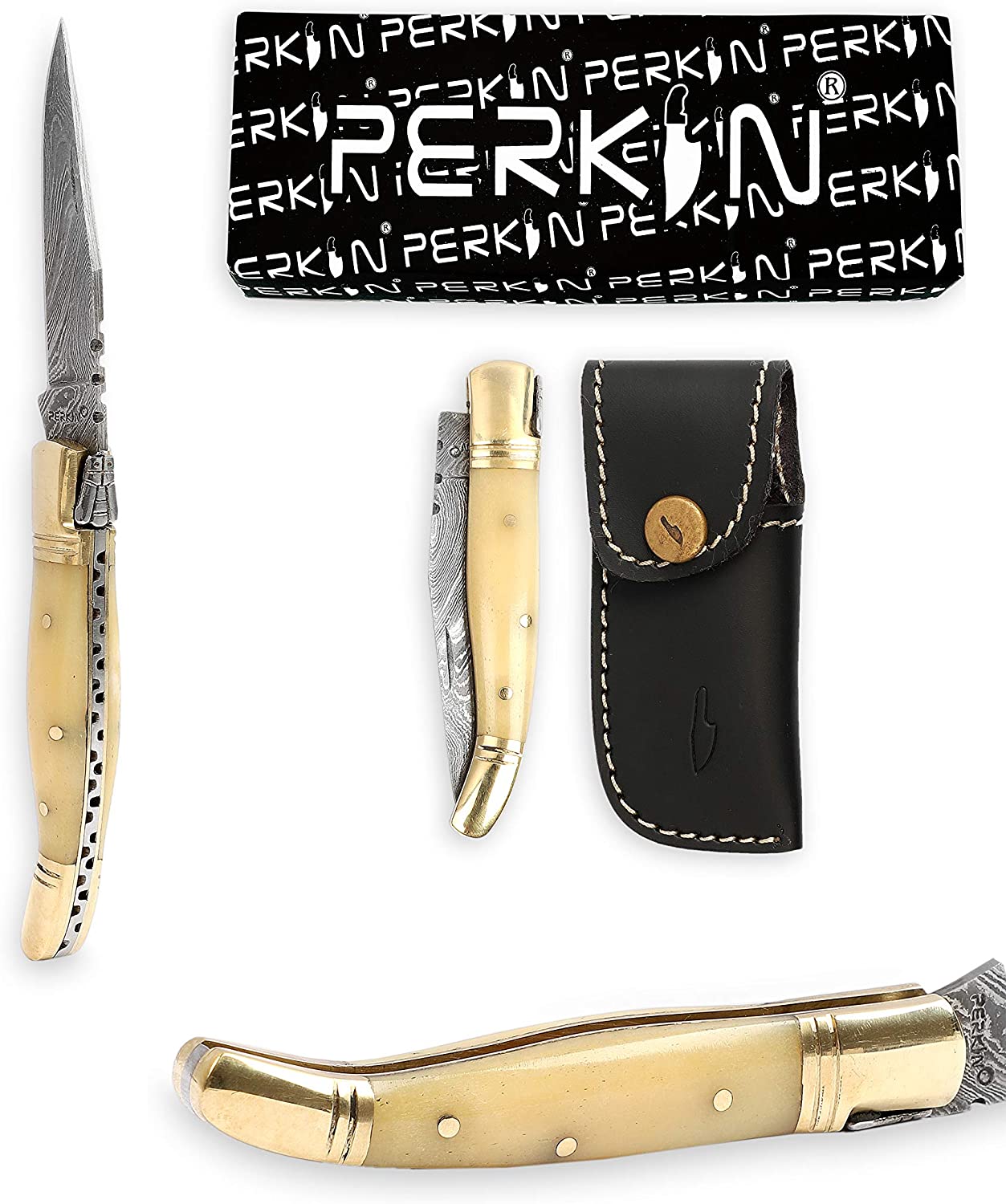 (nous vous conseillons d'affûter la lame pour avoir une utilisation optimale), Produit de qualité.Véritable acier de Damas.Lame aiguisée et fourreau en cuir de qualité.Lame pliante non verrouillable de moins de 7,6 cm.