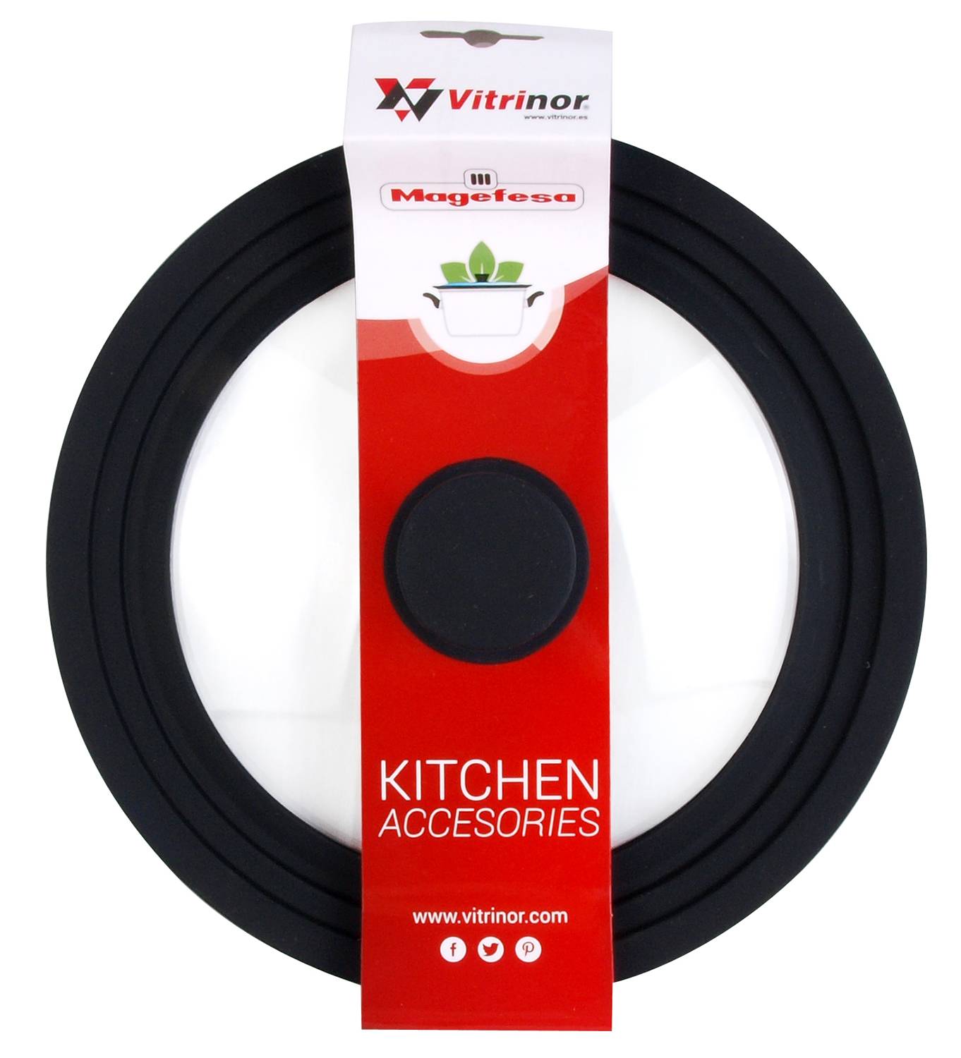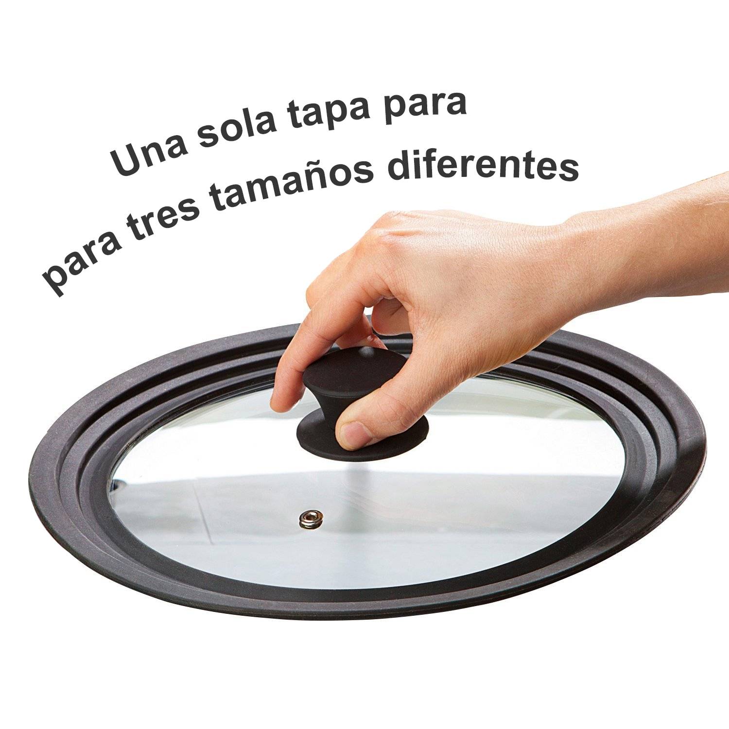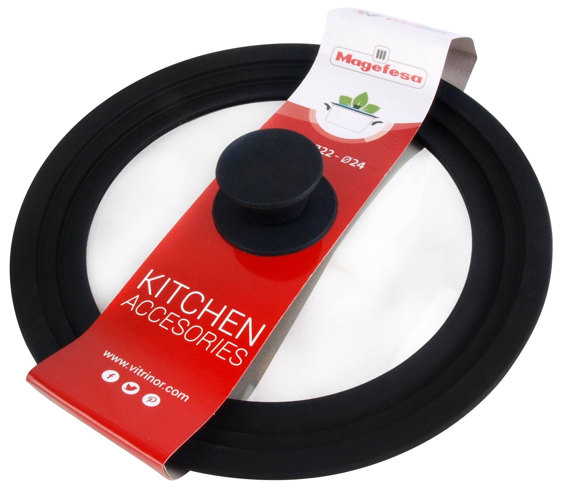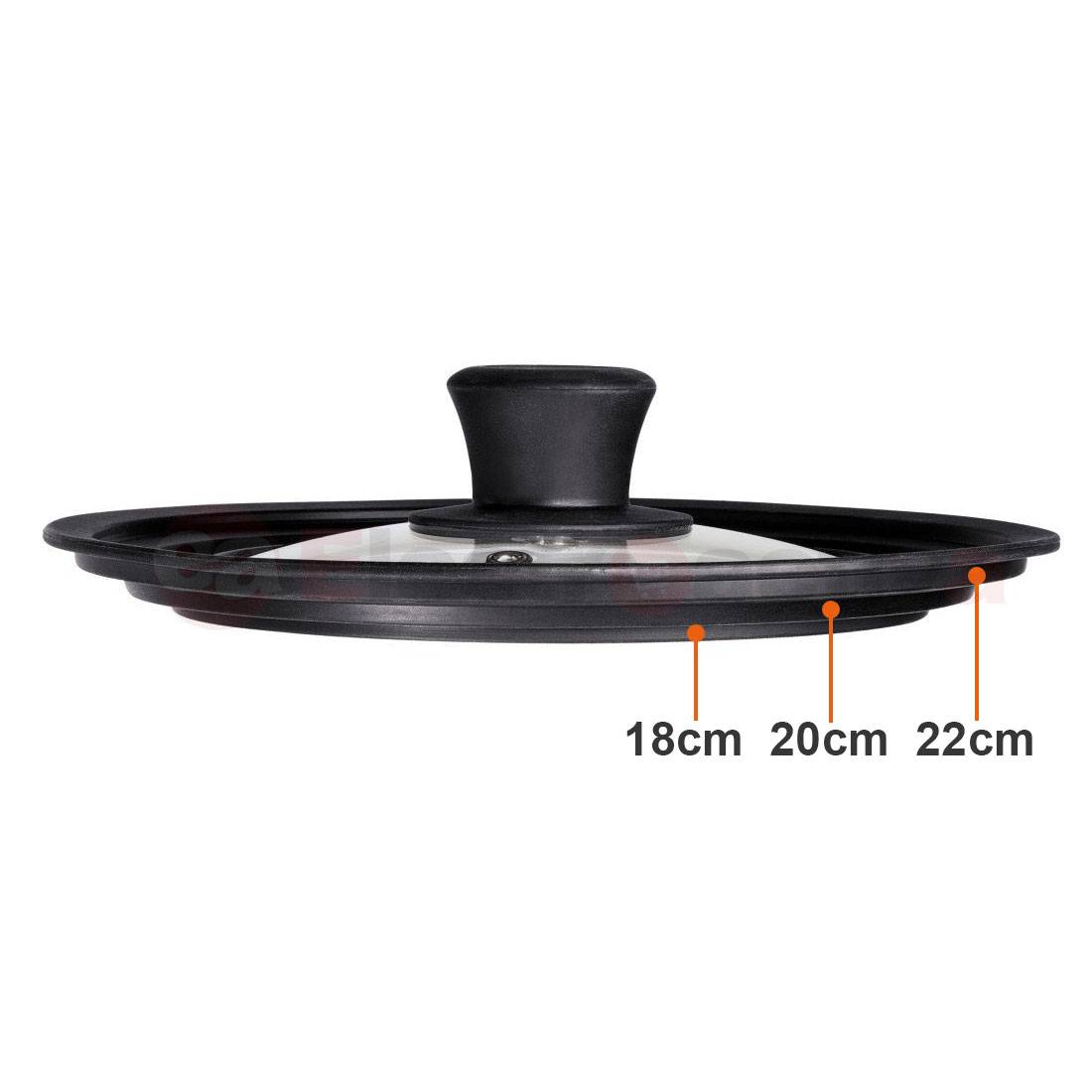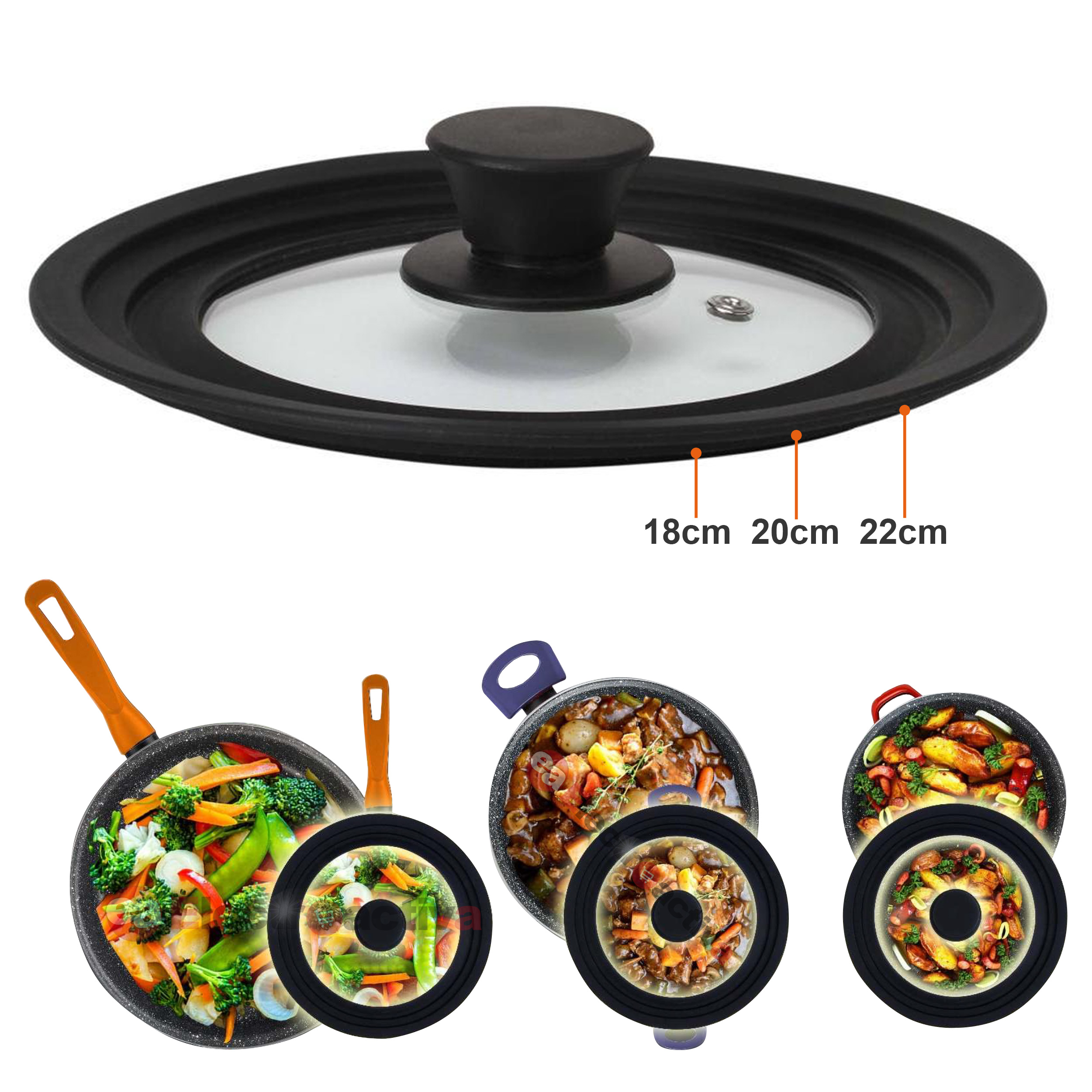 Couvercle universel Magefesa composé de 1 x 18cm-20cm-22cm Couvercle à plusieurs diamètres, chaque couvercle s'adapte parfaitement sur TROIS diamètres différents de pièces de cuisson Permet de gagner de la place et de voir la cuisson des aliments En verre trempé, avec sortie de vapeur, bord et bouton en silicone résistant à la chaleur Facile à nettoyer et lavable au lave-vaisselle