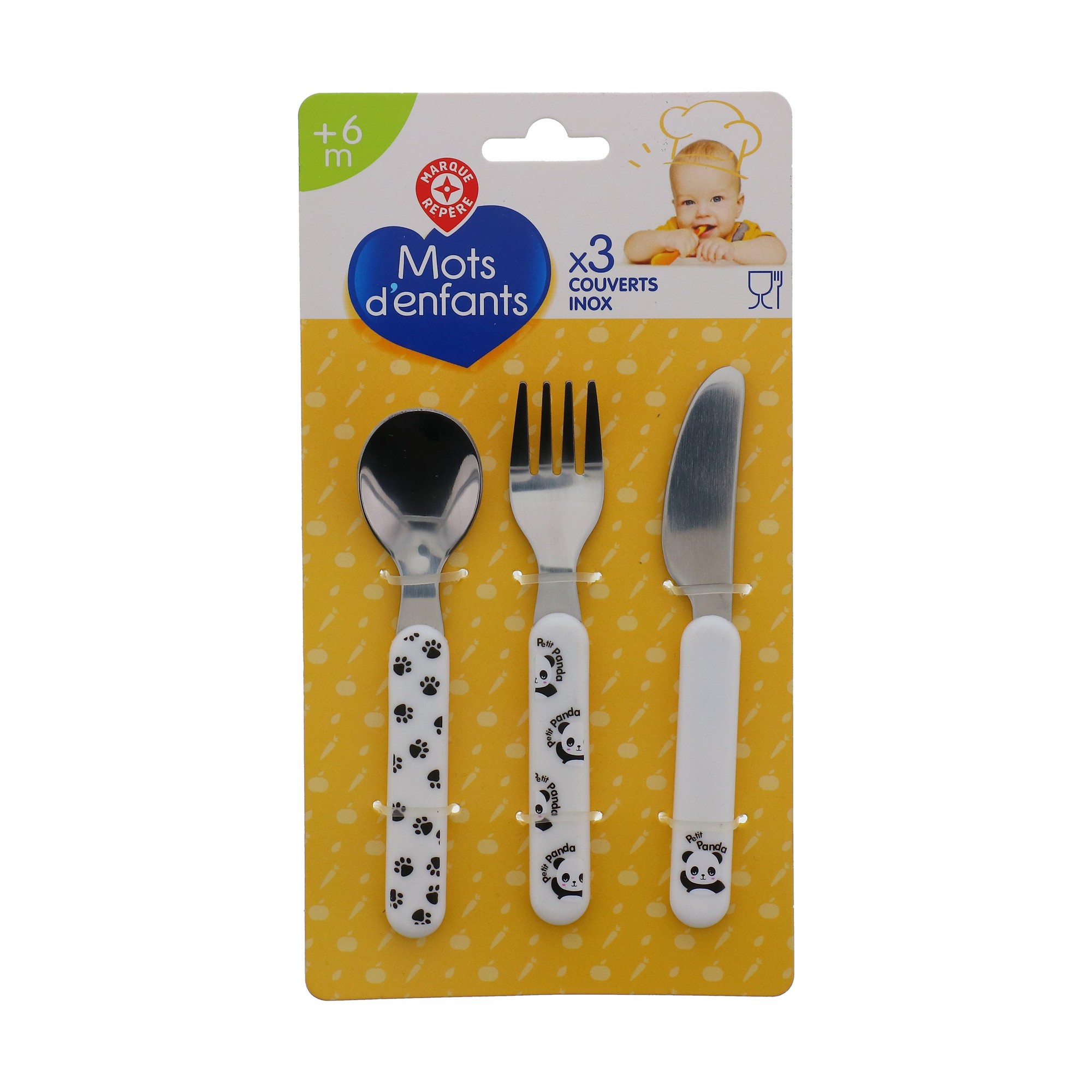 | Libellé | Couverts - mots d'enfants - lot de 3 couverts avec 1 cuillère, 1 fourchette et 1 couteau bout rond |