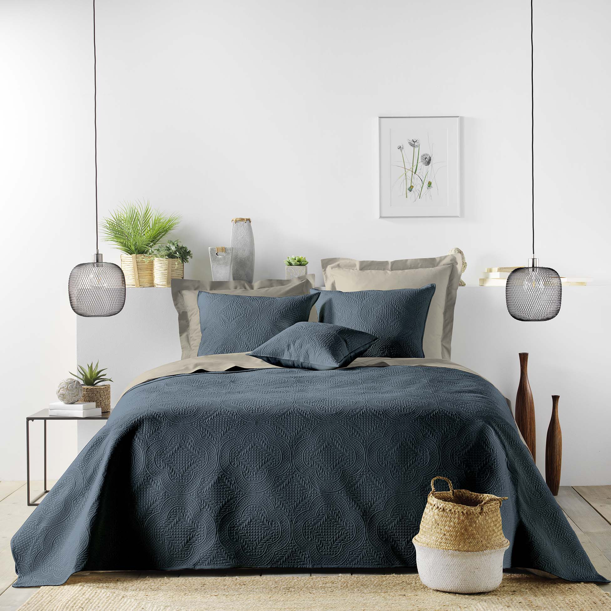 Couvre lit matelasse Romano Dimensions : largeur 220 x longueur 240 cm (lit 2 personnes). Matière : 100 % polyester microfibre (65 gr/m²). Finition : finition biais. Imprimé : couvre-lit matelassé style ethnique. Entretien: lavage à 40° séparément, repassage possible. Certification Oeko-Tex® Garantit que les articles testés et certifiés ne présentent pas de substances nocives pouvant nuire à la santé. Les accessoires, les oreillers, les taies, les draps présents sur le visuel ne sont pas vendus avec le Couvre lit. Sans housse de coussin , les housses sont vendues a part à l'unité afin de pouvoir faire des assortiments