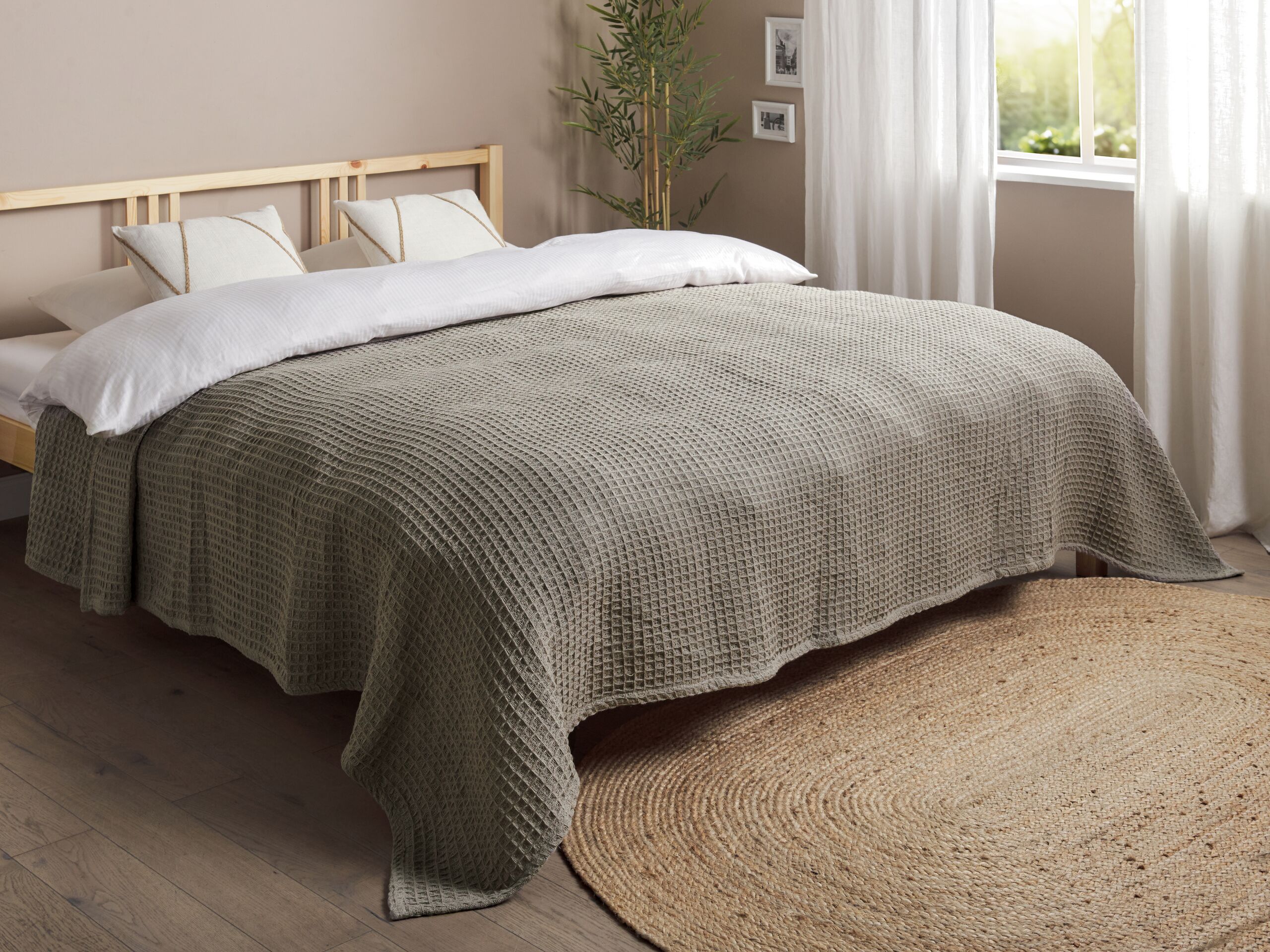 Jeté de lit gaufré. Ce couvre-lit gaufré aux tons neutres ajoute une touche de chaleur à tout espace de vie. Son design texturé et son tissu en coton doux créent une atmosphère douillette dans la chambre à coucher ou le salon. Il est parfait pour se blottir contre un livre ou pour profiter d'une sieste paisible l'après-midi, mais aussi pour décorer simplement votre espace.