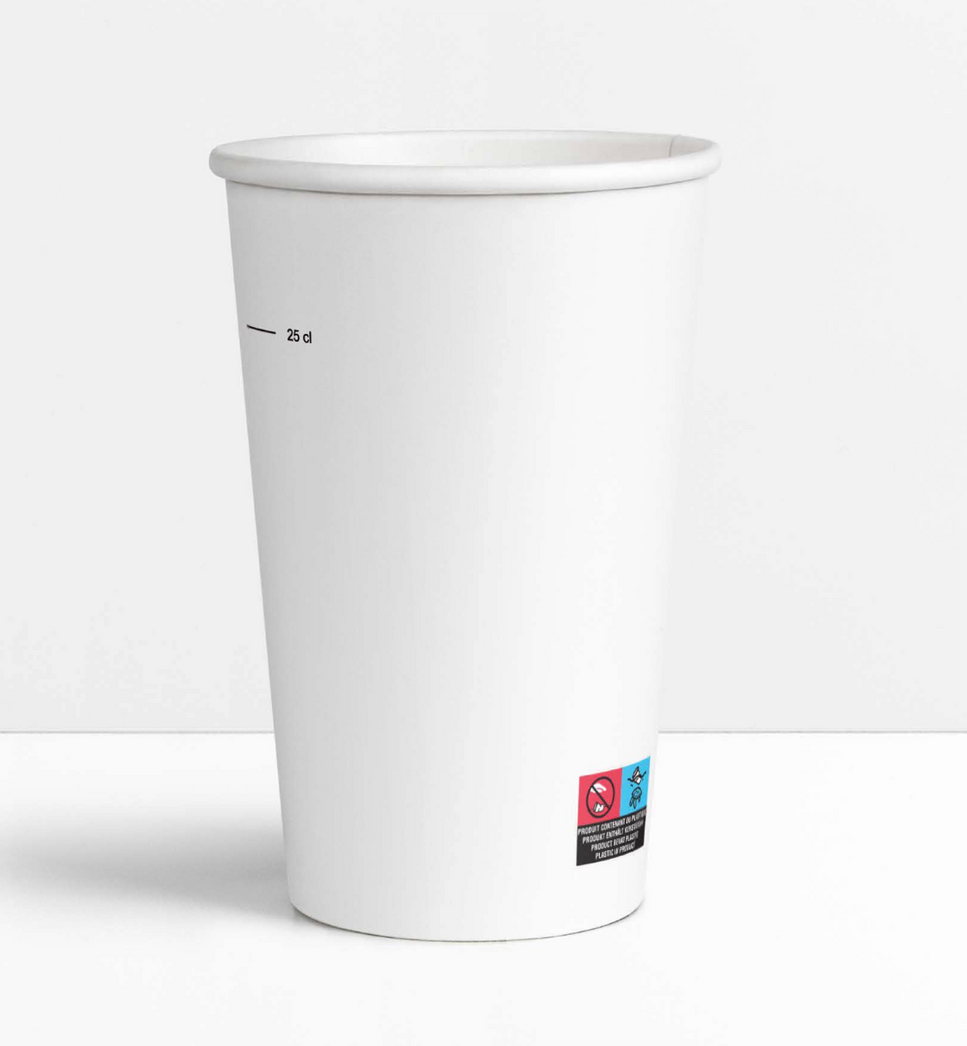 Gobelet carton blanc 35 cl avec graduation 25 cl et marquage UE Code Produit Colis reconstitué petite série (1 ramette de 80) : 221280GOB Code produit Colis 2000 : 22128025GOB Laminé couche PE et recyclable Le gobelet en carton cl : idéal pour la vente à emporter de boissons froides ou chaudes ! Ces gobelets en carton blanc ont une contenance de 35 cl. Ils sont idéaux pour tout type de boissons froides ou chaudes. Adaptés aux boissons chaudes (café, thé, chocolat chaud...) grâce à leur grammage de 235gsm/m2 ou froides (eau, soda, jus de fruits...), nos gobelets carton supportent des liquides allant jusqu'à +120°C et peuvent même passer au micro-ondes (passage rapide). Ils sont résistants et totalement étanches. Nos gobelets en carton seront parfaits pour la vente à emporter de boissons. Grâce à leur capacité moyenne de 8 oz, ils pourront même être utilisés comme pot pour condiments (plateau-repas traiteur, fast-food...). De couleur blanche, ils s'adapteront parfaitement à toutes vos ambiances. Les gobelets en carton vendus sur la marketplace Covr sont recyclables après utilisation et certifiés aptes au contact alimentaire. Nos gobelets en carton à usage unique sont conditionnés par lots de 25 ramettes de 80 gobelets soit 2000 gobelets par carton. Ils bénéficient d'un rapport qualité/prix imbattables : vous payez votre gobelet seulement 0,0549€HT l'unité ! Et à ce prix, la livraison est incluse ! Nous livrons partout en France en 48/72h. Ils seront parfaits pour les professionnels à la recherche d'un produit pratique et économique. C'est une bonne alternative pour remplacer les gobelets en plastique. Caractéristiques Epaisseur carton : 235 gsm/m2 - 15 PE Contenance : 12 oz / 350 ml Diamètre haut (mm) : 80 Hauteur (mm) : 117 Diamètre bas (mm) : 51 Poids (gr) : 7,5 Ramettes : 80 Ramettes par carton : 25 Gobelets par carton: Total: 2000 Dimensions carton WxDxH (cm) : 40x40x63,5 Poids carton (kg) : 16 Volume carton (m3) : 0.106 Palletisation (GKN/Euro) : 80x120 cm Hauteur palette (m) : 2.15 Cartons par niveau : 6 Cartons par palette : 18 Poids palette (kg): 303 kg