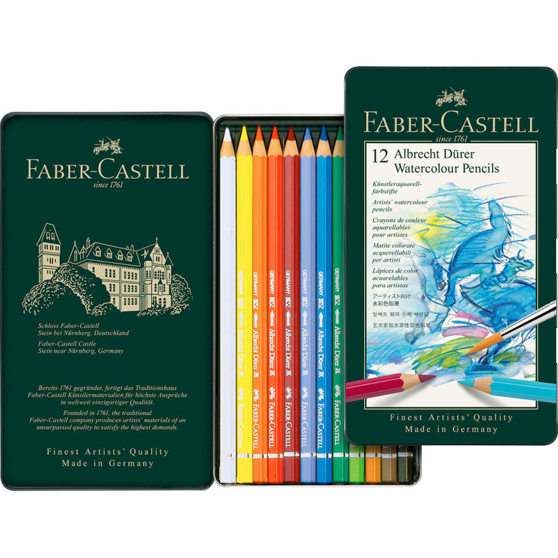 FABER-CASTELL - Crayons aquarellable "Albrecht Dürer" - Boîte de 12 . Les crayons de couleur aquarellables Albrecht Dürer permettent à l'artiste une expression variée du dessin, de la peinture et de l'aquarelle. Des matériaux de haute qualité et l'expérience de Faber-Castell depuis plus de 250 ans font en sorte que ces crayons de couleur aquarellables sont inégalés dans leur brillance et leur solubilité dans l'eau. Quelques coups de pinceaux suffisent pour étaler les couleurs et faire ressortir toute leur brillance. En fonction du papier utilisé, la couleur appliquée peut être dissoute complètement et devient une couleur aquarelle classique..