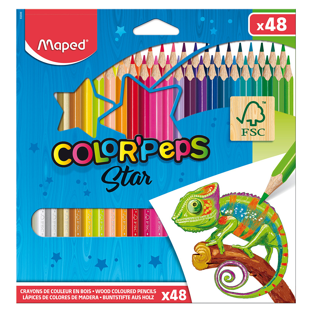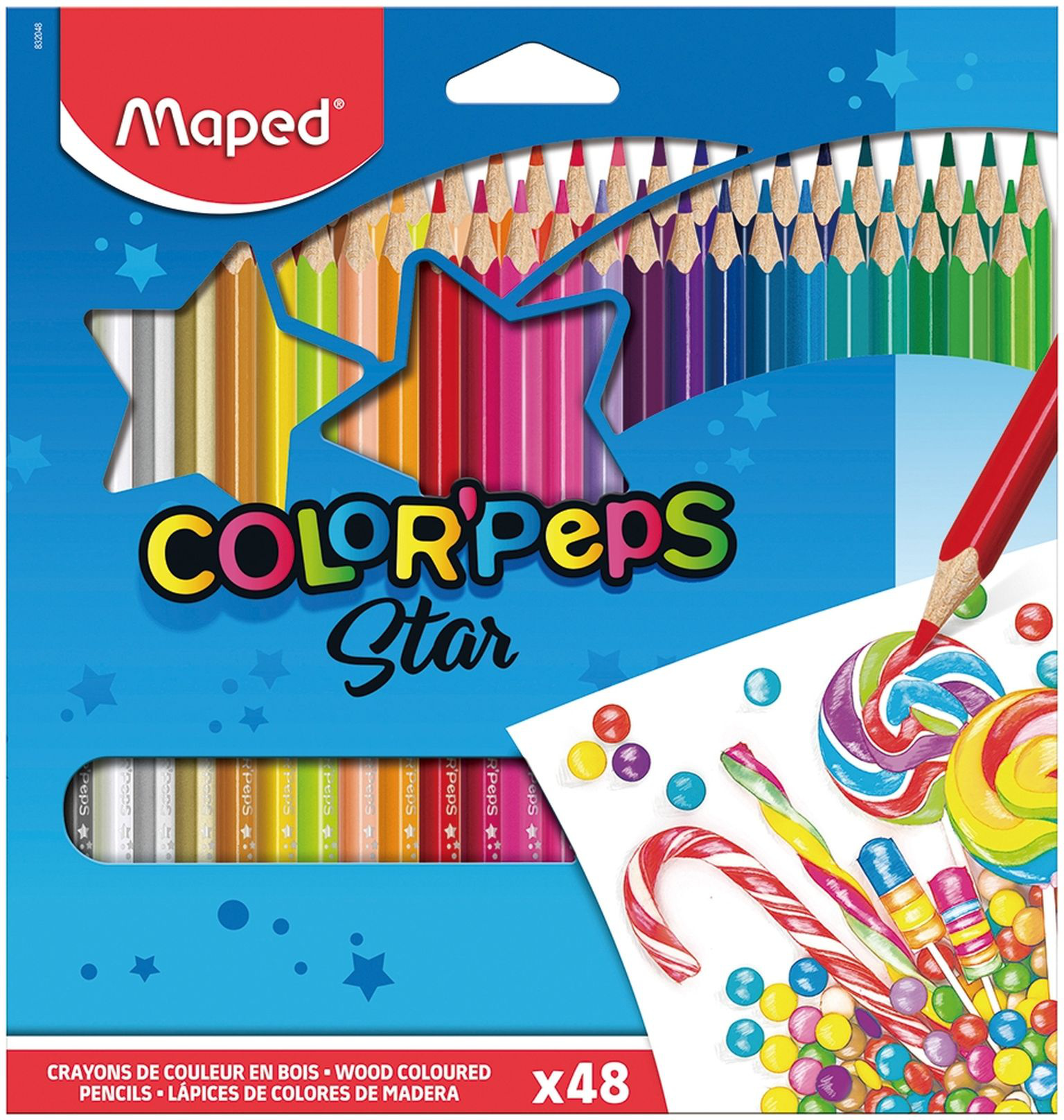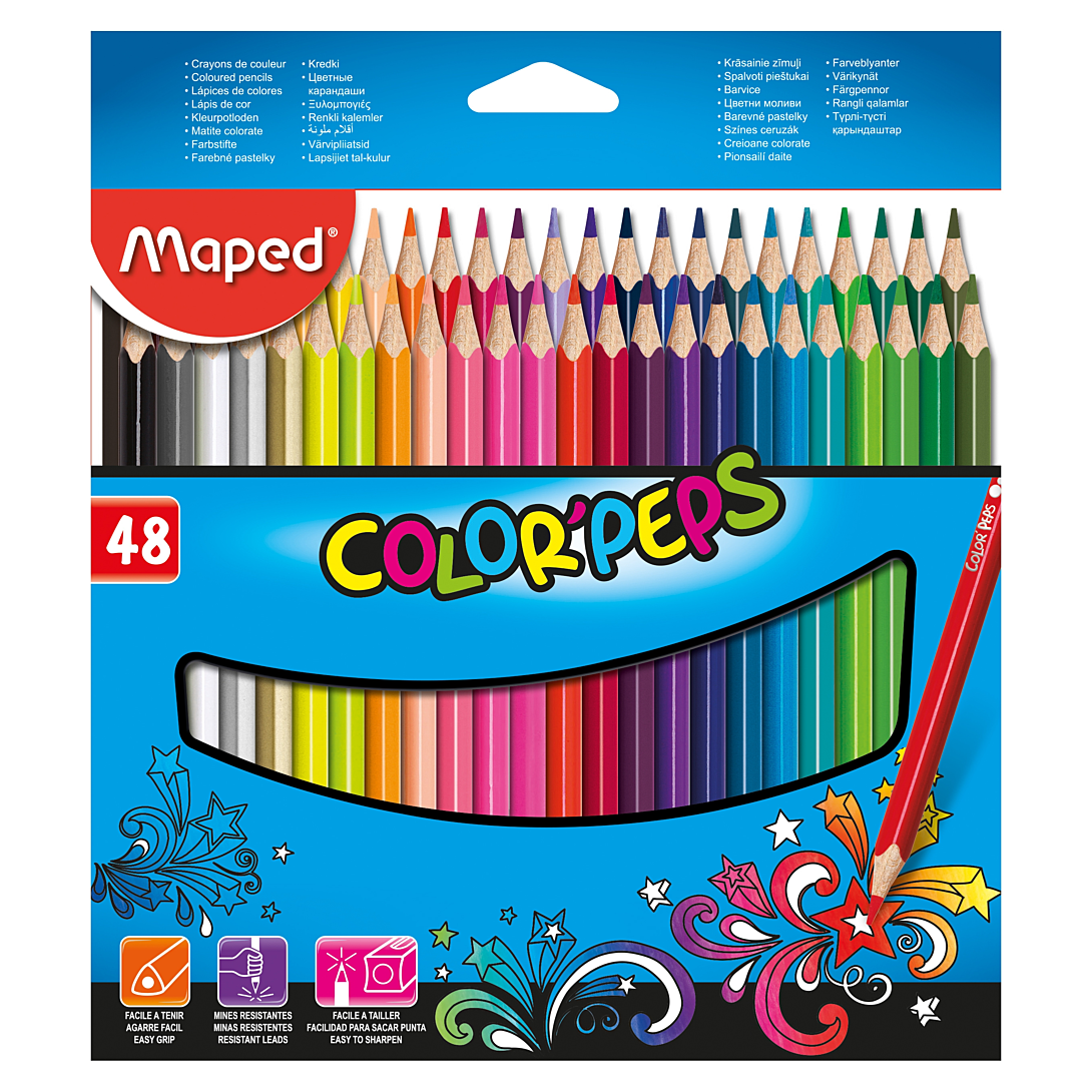 Pochette de 48 crayons de couleur dont 4 fluos, un or et un argent. Crayons triangulaires pour une prise en main facile et confortable. Facile à tailler, couleurs lumineuses.