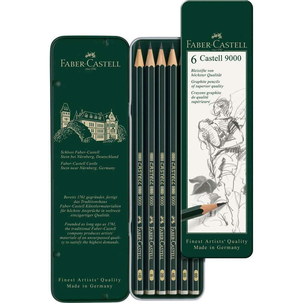 FABER-CASTELL - Crayons graphite "Castell 9000" - Etui métal de 6  . Le Castell 9000 - un vrai classique parmi les crayons graphite - a été lancé sur le marché en 1905 par le comte Alexander von Faber-Castell. Sa qualité ainsi que le grand choix de duretés en ont fait un outil de travail indispensable des artistes et dessinateurs. Sa mine est entièrement collée au bois et est ainsi très résistante au bris. Idéal pour tous les travaux artistiques et techniques..