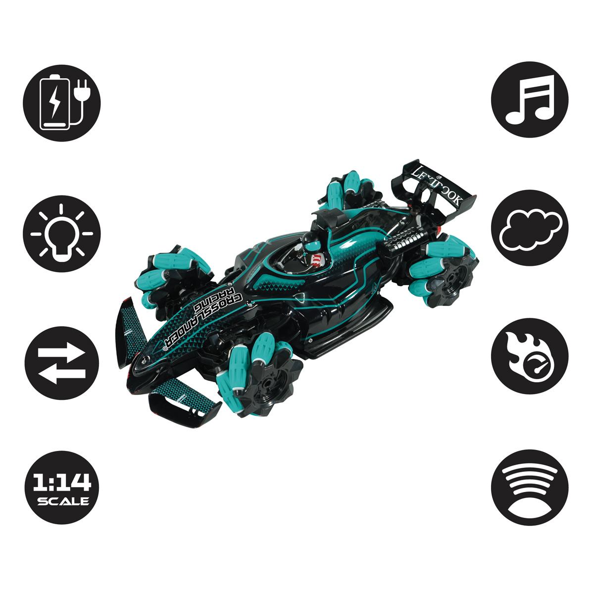 Crosslander Racing" voiture télécommandée Pneus adhérents et 4 roues motrices Voiture de course lumineuse Aventure et amélioration des capacités motrices Buse : effets de fumée pour un départ de course encore plus impressionnant (une pipette est incluse pour remplir le réservoir d'eau) Fonction dérive : mouvements latéraux et diagonaux Vitesse maximale : 10 km/h / échelle 1/14 Télécommande ergonomique Effets lumineux et sonores étonnants qui confèrent du dynamisme Fréquence 2,4 GHz Mode démo Batterie rechargeable dure 20 minutes / Temps de charge : 2-3 heures (câble USB fourni) La télécommande nécessite deux piles 1,5 V AA/LR6 (non fournies), le compartiment à piles s'ouvre avec un tournevis (non fourni) Dimensions approximatives : 36 x 17 x 11 cm