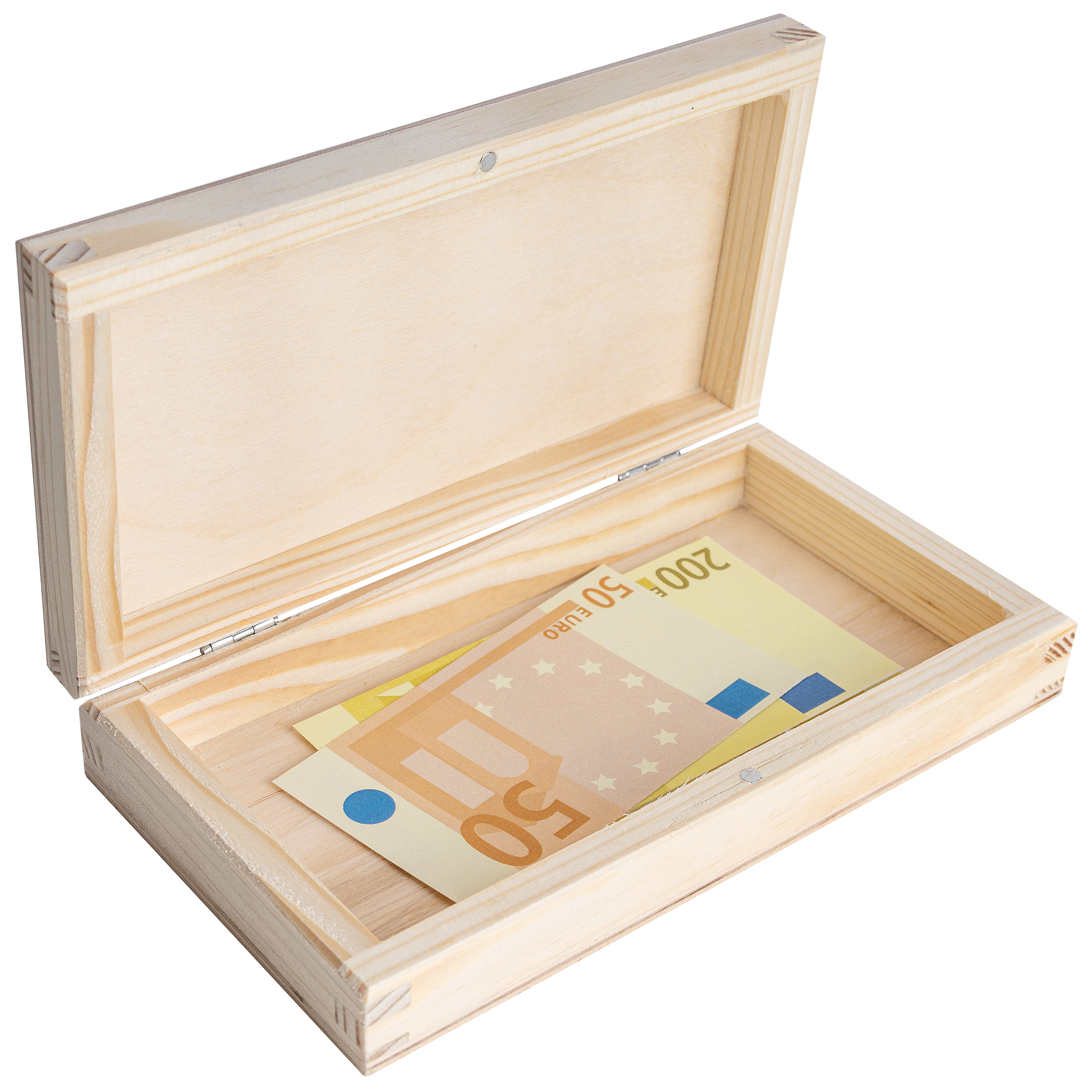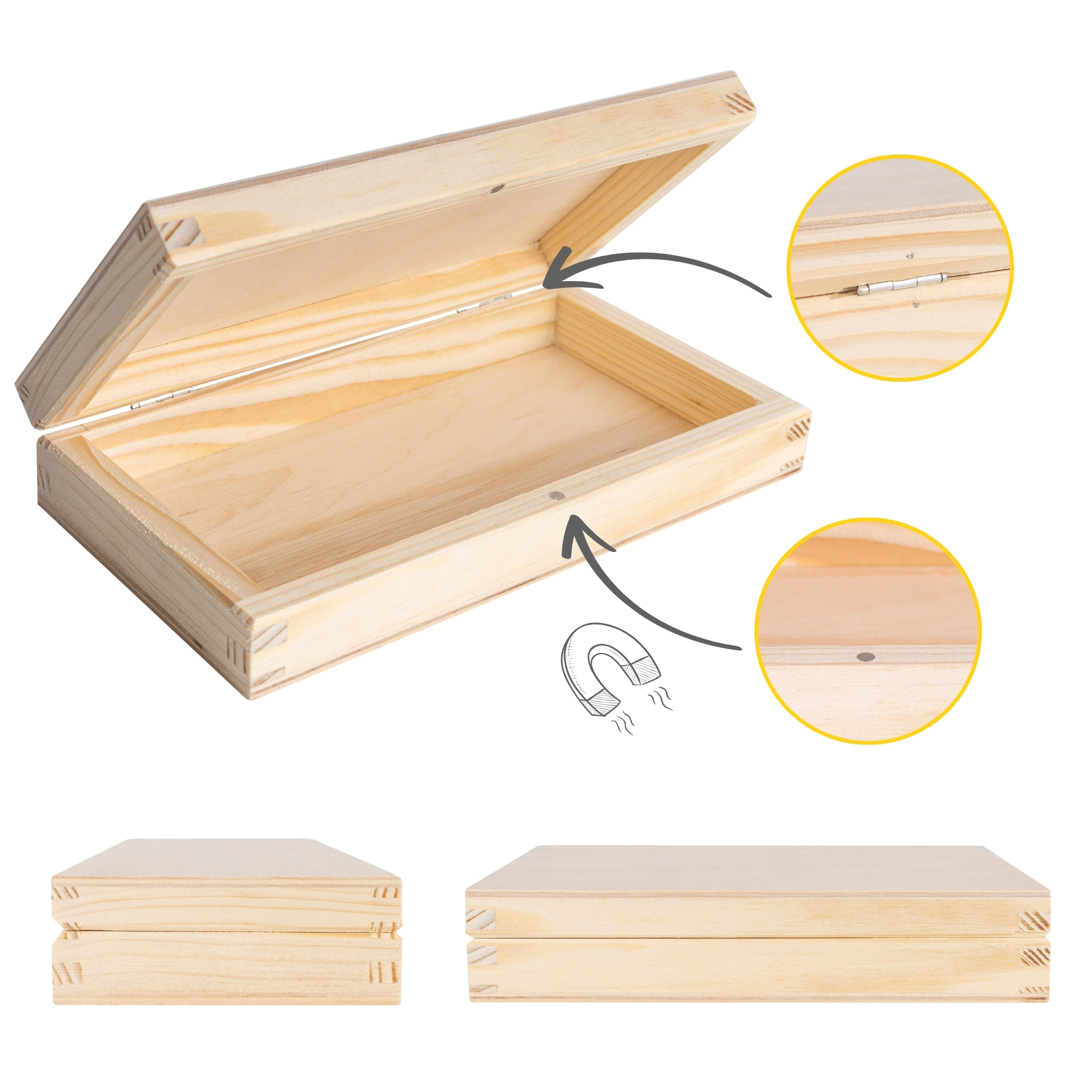 TAILLE IDÉALE - Notre boîte en bois est parfaite pour ranger de l'argent, des bijoux, des souvenirs ou autres petits objets. La petite boîte est compacte et peut donc facilement se ranger dans une commode, une table de chevet ou un bureau. PARFAIT POUR DU DIY - Le coffre a un design simple et minimaliste, ce qui vous permet de le personnaliser selon vos envies. Vous pouvez le peindre ou le décorer à la main en y ajoutant vos propres éléments décoratifs pour lui donner un look unique. Notre petite boîte en bois est un excellent choix pour les personnes recherchant un élément pratique et esthétique pour y ranger leurs trésors. CADEAU UNIQUE - Notre coffret est une excellente idée de cadeau pour diverses occasions, comme pour un anniversaire, un mariage ou la Saint-Valentin. Vous pouvez également le personnaliser avec un message gravé ou le nom du destinataire, ce qui rendra le cadeau encore plus spécial. Ce n'est pas seulement un objet utile, mais aussi un souvenir unique. HAUTE QUALITÉ - Notre boîte est solide et résistante aux dommages. Elle vous servira pendant de nombreuses années tout en conservant sa qualité. Elle est fabriqué en bois de pin de haute qualité, ce qui lui confère un aspect naturel et universel. Le bois est non seulement durable, mais c’est aussi un beau matériau qui convient à de nombreux styles de décoration intérieure. FABRIQUÉ DANS L'UE - Nos boîtes de rangement sont fabriquées à partir de matériaux naturels et non toxiques. C'est pourquoi, nous pouvons garantir une haute qualité de nos produits à nos clients.