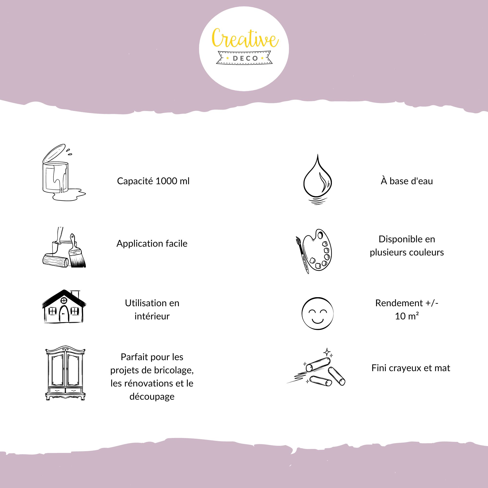 | Libellé | Creative Deco Peinture à la Craie Lilas 1L | Mat et Lavable | Peinture Bois | Rénovation Meubles | Ardoise Craie |