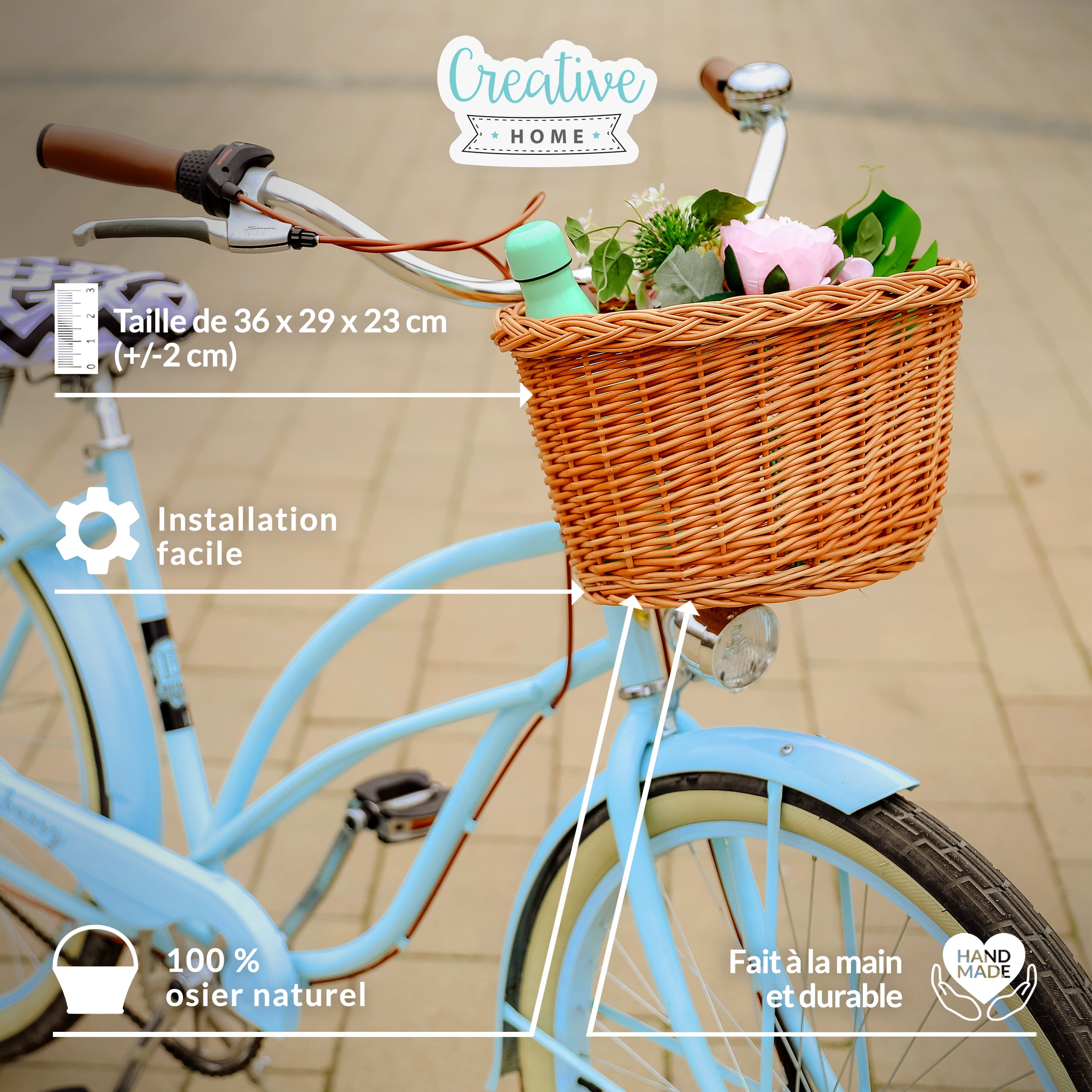 EXCELLENTE QUALITÉ - Le panier à vélo Creative Home est fabriqué à la main à partir de 100 % d'osier naturel. Durable et résistant, il est aussi très confortable grâce à son poids léger. Le panier est tissé à la main, ce qui le rend unique. Les dimensions peuvent variées de +/- 2 cm MULTIFONCTIONNEL - Le panier à vélo peut être utilisé au quotidien, comme élément de décoratif sur votre vélo. Il sera parfait pour faire du shopping ou transporter de petits objets comme des fleurs, des lettres, ou des bouteilles. Parfait également comme sac à main. GRAND CONFORT - S'enlève rapidement et facilement. Son transport est pratique grâce à sa légèreté. C'est un rangement idéal lorsque vous faites du vélo. DESIGN INTEMPOREL - Le panier a un design simple et élégant qui ne se démodera pas dans le temps. Il est universel et donne à votre vélo un look unique. CONÇU EN GRANDE-BRETAGNE ET FABRIQUÉ DANS L'UE - En tant que marque britannique, nous achetons nos produits dans l'Union européenne, où les normes sont parmi les plus élevées au monde. C'est pourquoi, nous sommes certain d'avoir des produits de qualité sur le marché. Nos produits sont fabriqués à partir de matériaux naturels et non toxiques.