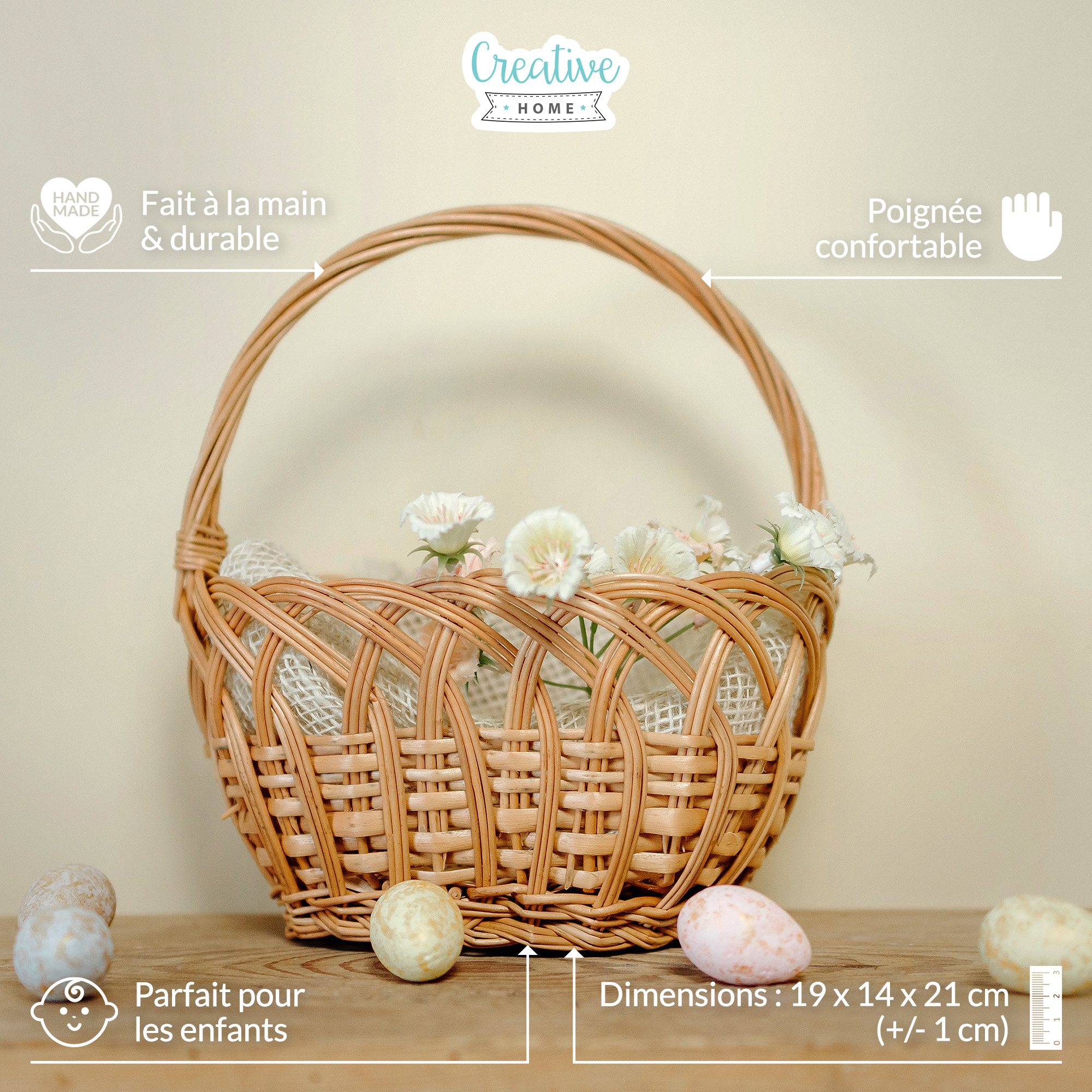 | Libellé | Creative Home Petit Panier en Osier Tressé pour Enfant | 19 x 14 x 21 cm (+/- 1 cm) | Léger et Durable | Panier de Pâques Enfants | Panier de Fruits |