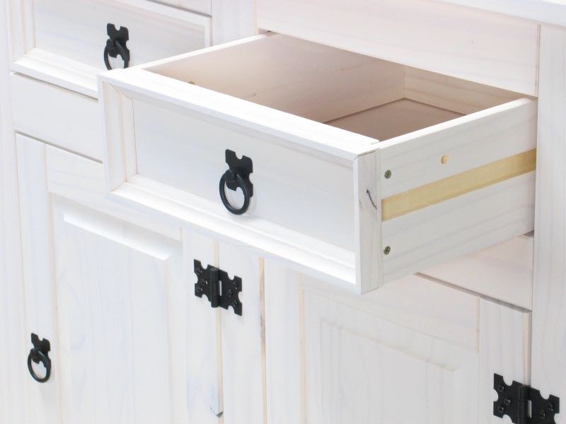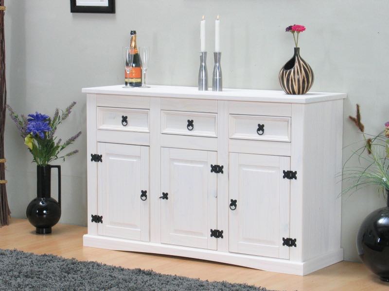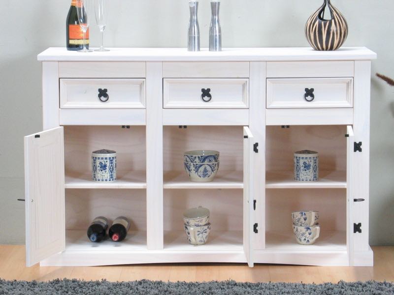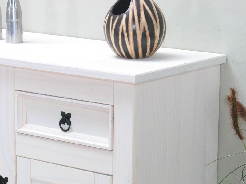 Buffet New Mexico largeur 132 cm, hauteur 84 cm avec 3 tiroirs et 3 portes blanc/cire est un buffet de couleur nan qui apporte à la fois style et fonctionnalité à votre intérieur. Magnifique et spacieux buffet avec 3 portes et 3 tiroirs de style antique de notre série de meubles « Mexico ». Le buffet est fabriqué en pin massif traité blanc/cire. Vous pouvez voir la structure du bois à travers la couleur blanche. Derrière les portes, vous trouverez 1 étagère libre continue. Le buffet semble solide et de bonne qualité. Ce produit est créé avec un souci du détail, ce qui garantit à la fois un attrait esthétique et une grande durabilité. Il est conçu dans un souci à la fois de fonctionnalité et de style, ce qui en fait le choix parfait pour n’importe quelle pièce de votre maison. Les matériaux utilisés sont de haute qualité, ce qui confère au produit une longue durée de vie et lui permet de résister à une utilisation quotidienne. Que ce soit pour le rangement ou comme ajout décoratif, ce produit rehaussera votre décor et apportera plus de confort et d'élégance à votre maison.