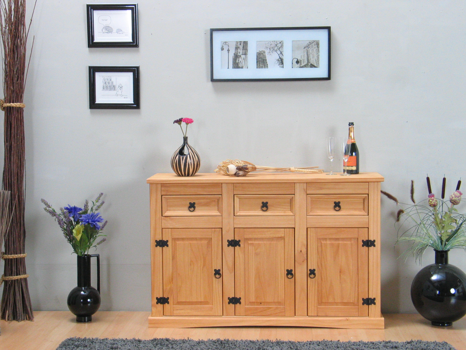 Buffet New Mexico avec 3 tiroirs et 3 portes, largeur 132 cm, hauteur 84 cm lessive/cire est un buffet de couleur nan, qui apporte à la fois style et fonctionnalité à votre intérieur. Magnifique et spacieux buffet avec 3 portes et 3 tiroirs de style antique de notre série de meubles « Mexico ». Le buffet est fabriqué en pin massif traité avec de la lessive/cire. Vous pouvez voir la structure du bois à travers. Derrière les portes, vous trouverez 1 étagère libre continue. Le buffet semble solide et de bonne qualité. Ce produit est créé avec un souci du détail, ce qui garantit à la fois un attrait esthétique et une grande durabilité. Il est conçu dans un souci à la fois de fonctionnalité et de style, ce qui en fait le choix parfait pour n’importe quelle pièce de votre maison. Les matériaux utilisés sont de haute qualité, ce qui confère au produit une longue durée de vie et lui permet de résister à une utilisation quotidienne. Que ce soit pour le rangement ou comme ajout décoratif, ce produit rehaussera votre décor et apportera plus de confort et d'élégance à votre maison.