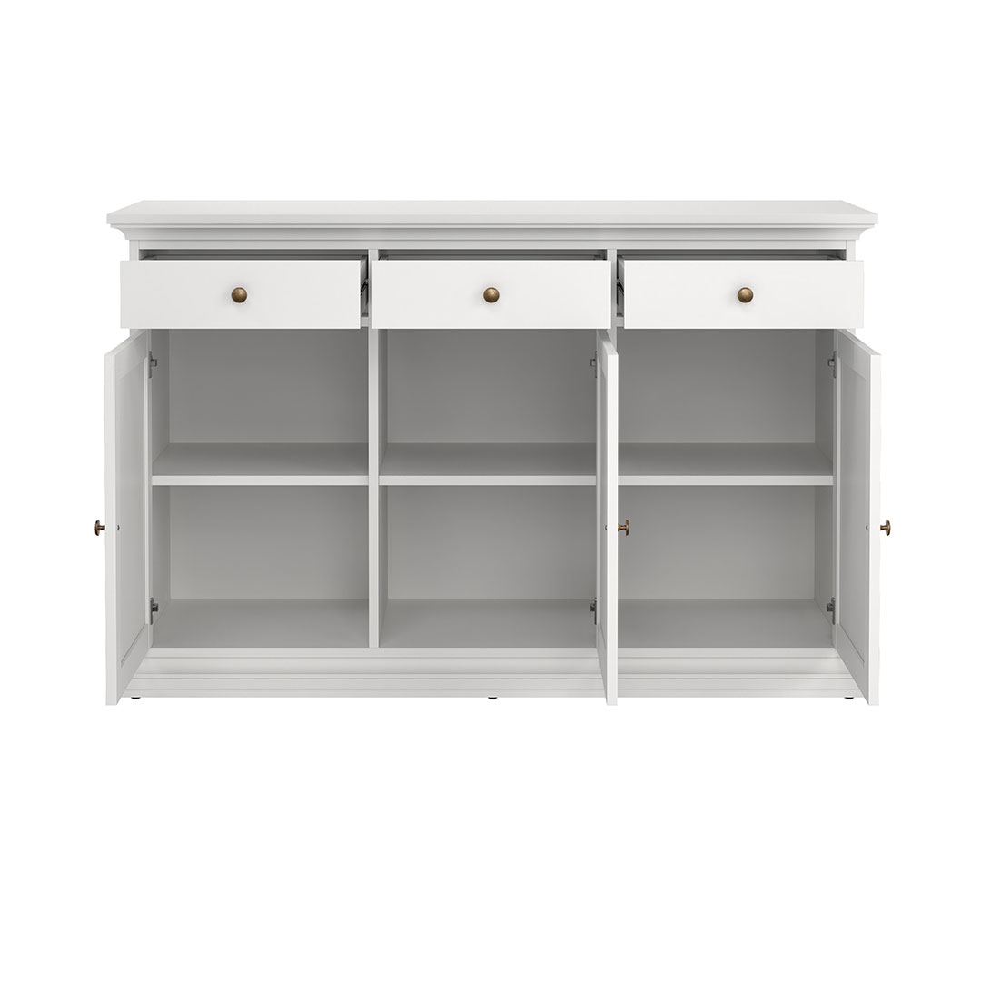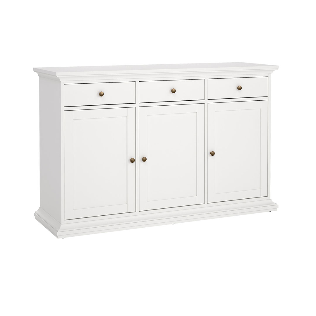 Buffet Venice 3 portes et 3 tiroirs, largeur 143 cm, hauteur 91 cm blanc est un buffet de couleur Blanc qui apporte à la fois style et fonctionnalité à votre intérieur. Buffet classique blanc avec 3 tiroirs et 3 portes avec poignées en métal. Le buffet peut être réglé en hauteur. Derrière chacune des 3 portes vous trouverez 1 étagère. Ici, vous disposez de beaucoup d’espace de rangement et s’intègre parfaitement dans la plupart des pièces de la maison. Ce produit est créé avec un souci du détail, ce qui garantit à la fois un attrait esthétique et une grande durabilité. Il est conçu dans un souci à la fois de fonctionnalité et de style, ce qui en fait le choix parfait pour n’importe quelle pièce de votre maison. Les matériaux utilisés sont de haute qualité, ce qui confère au produit une longue durée de vie et lui permet de résister à une utilisation quotidienne. Que ce soit pour le rangement ou comme ajout décoratif, ce produit rehaussera votre décor et apportera plus de confort et d'élégance à votre maison.