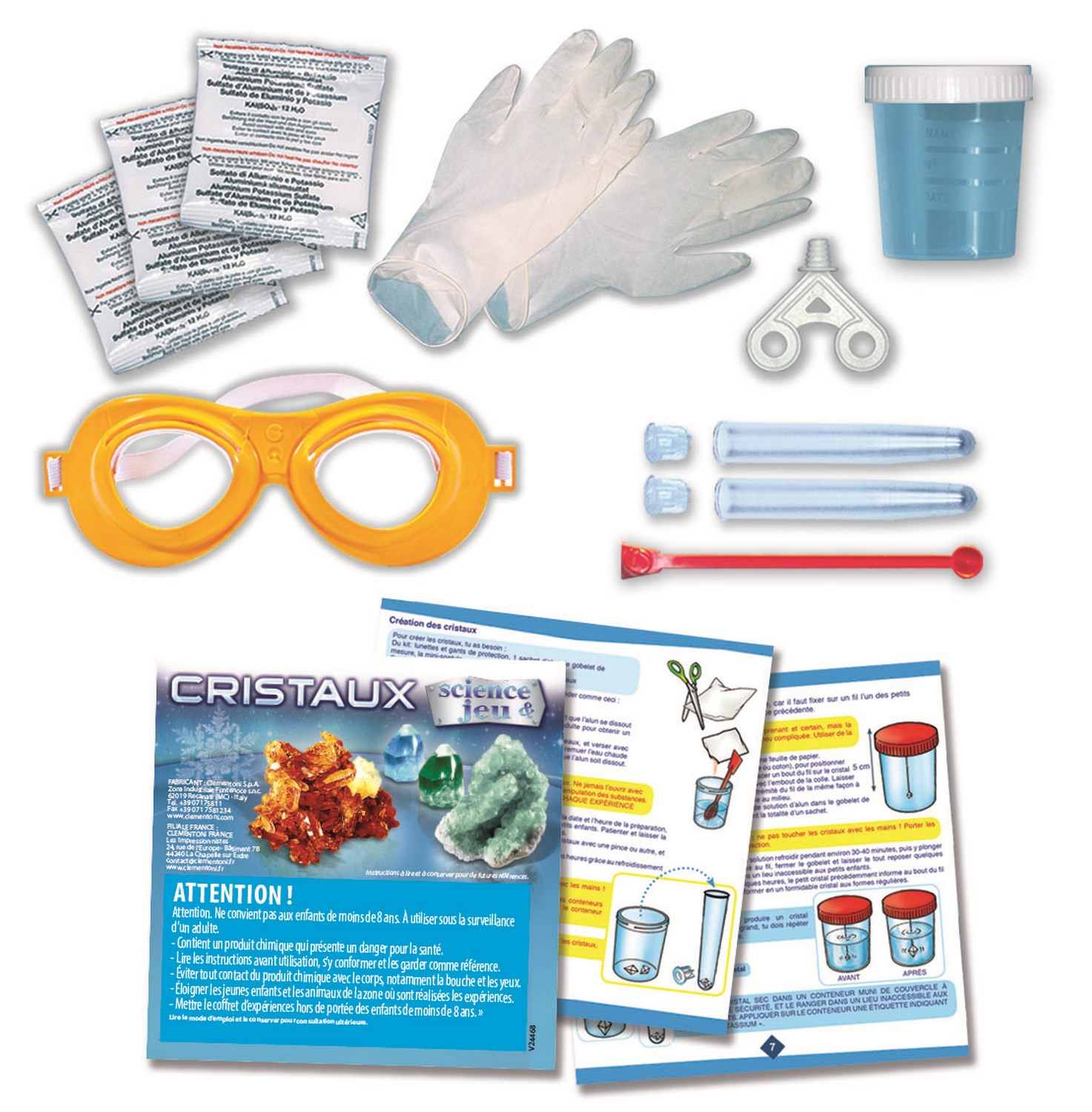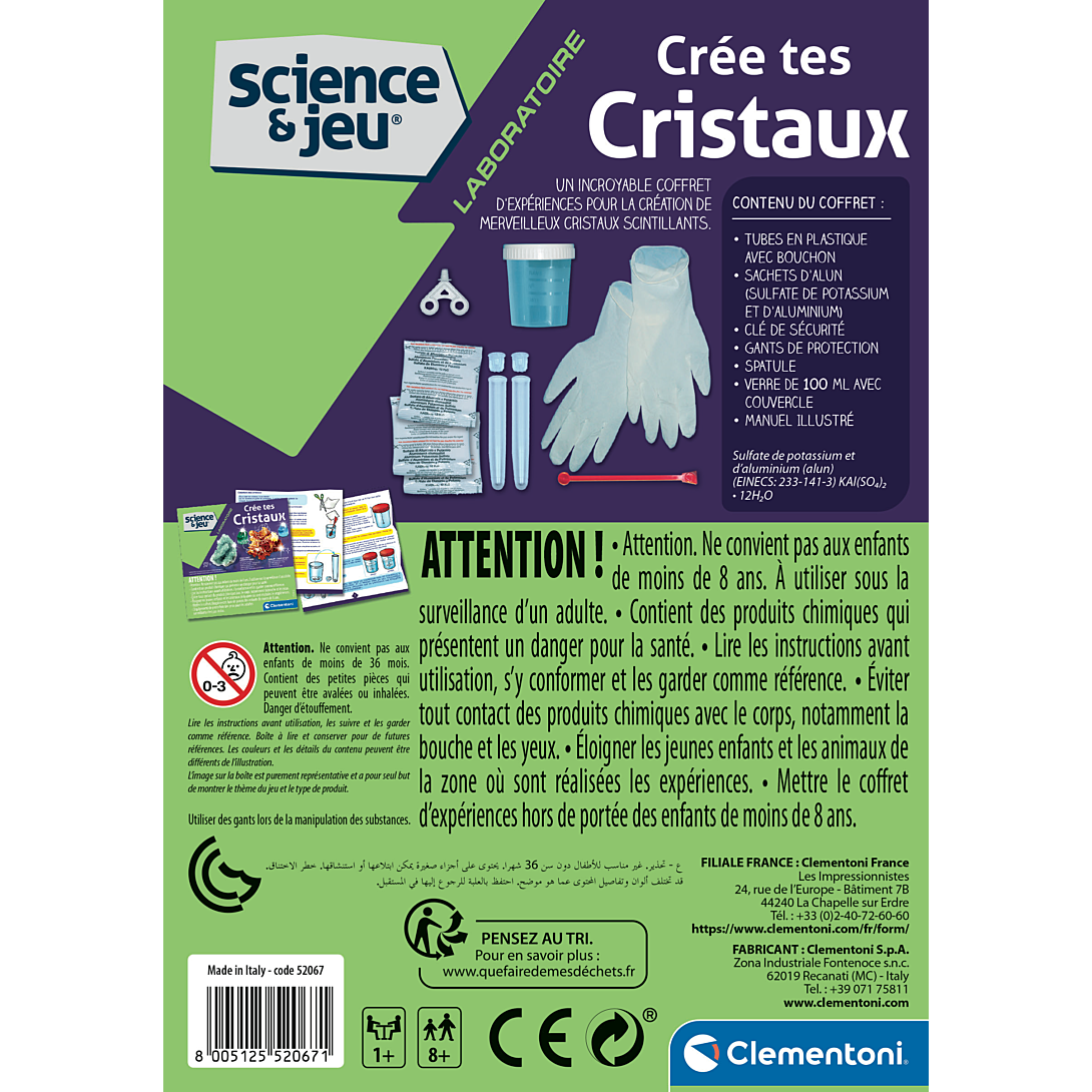 | Avertissements | Attention. Ne convient pas aux enfants de moins de 36 mois. Contient des petites pièces qui peuvent être avalées ou inhalées. Danger d'étouffement. Attention. Ne convient pas aux enfants de moins de 8 ans. À utiliser sous la surveillance d'un adulte. Contient des produits chimiques qui présentent un danger pour la santé. Éviter tout contact des produits chimiques avec le corps, notamment la bouche et les yeux. Éloigner les jeunes enfants et les animaux de la zone où sont réalisées les expériences. Mettre le coffret d'expériences hors de portée des enfants de moins de 8 ans. Utiliser des gants lors de la manipulation des substances. |