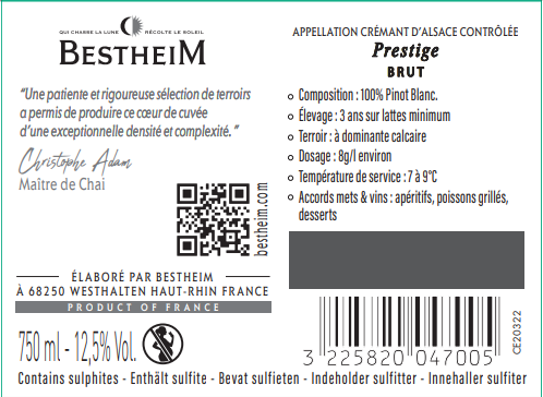 | Libellé | Crémant d'Alsace AOP Bestheim - Brut, 2019 - 75 cl - étiquette abîmée - étiquette abîmée |